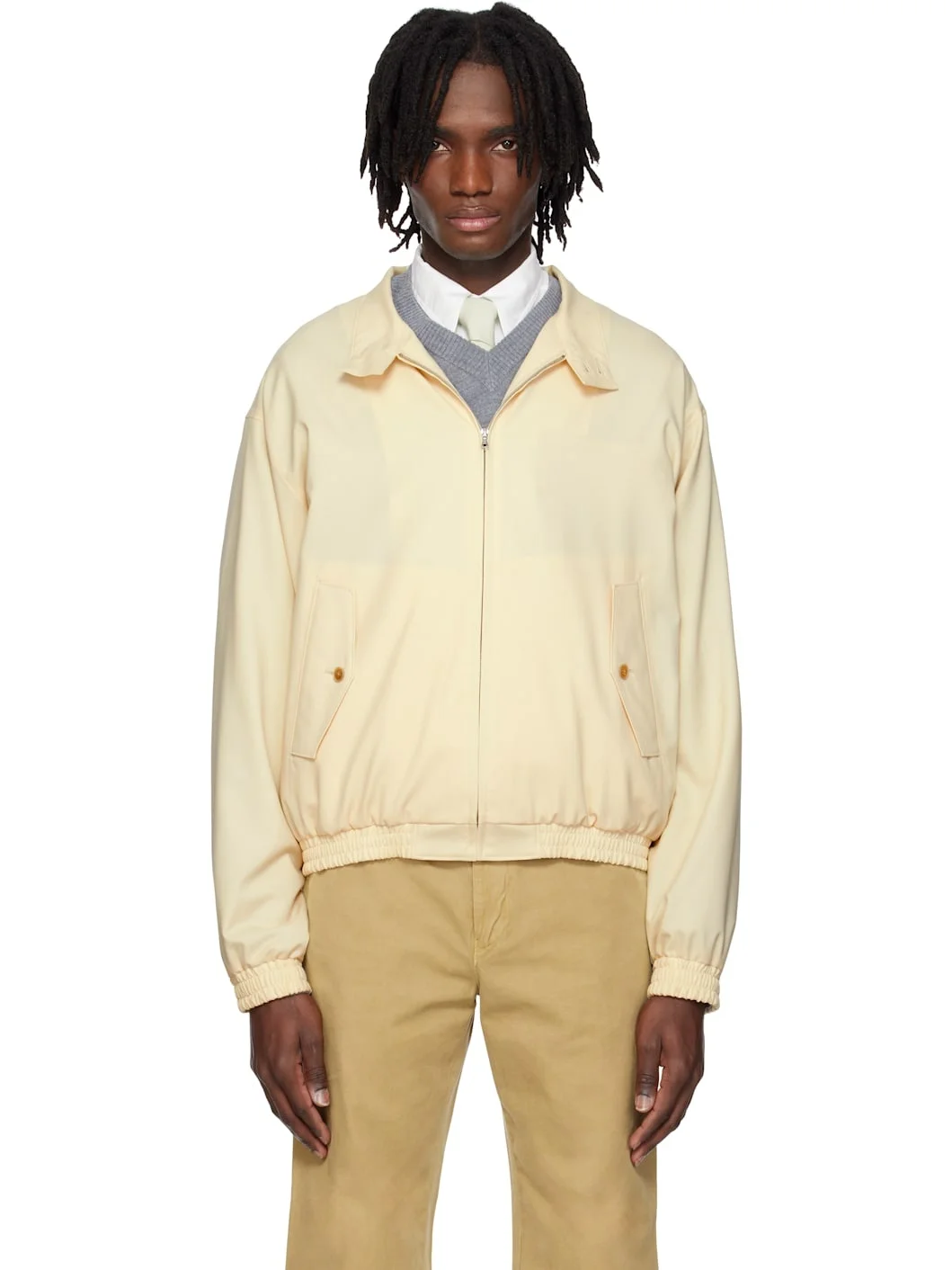 Superfine 180s tropical wool drill jacket. · Stand collar · Zip closure · Flap pockets · Elasticized hem and cuffs · Dropped shoulders Supplier color: Ivory 100% wool. Made in Japan 251484M180004