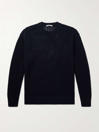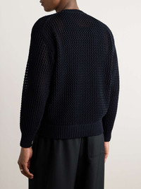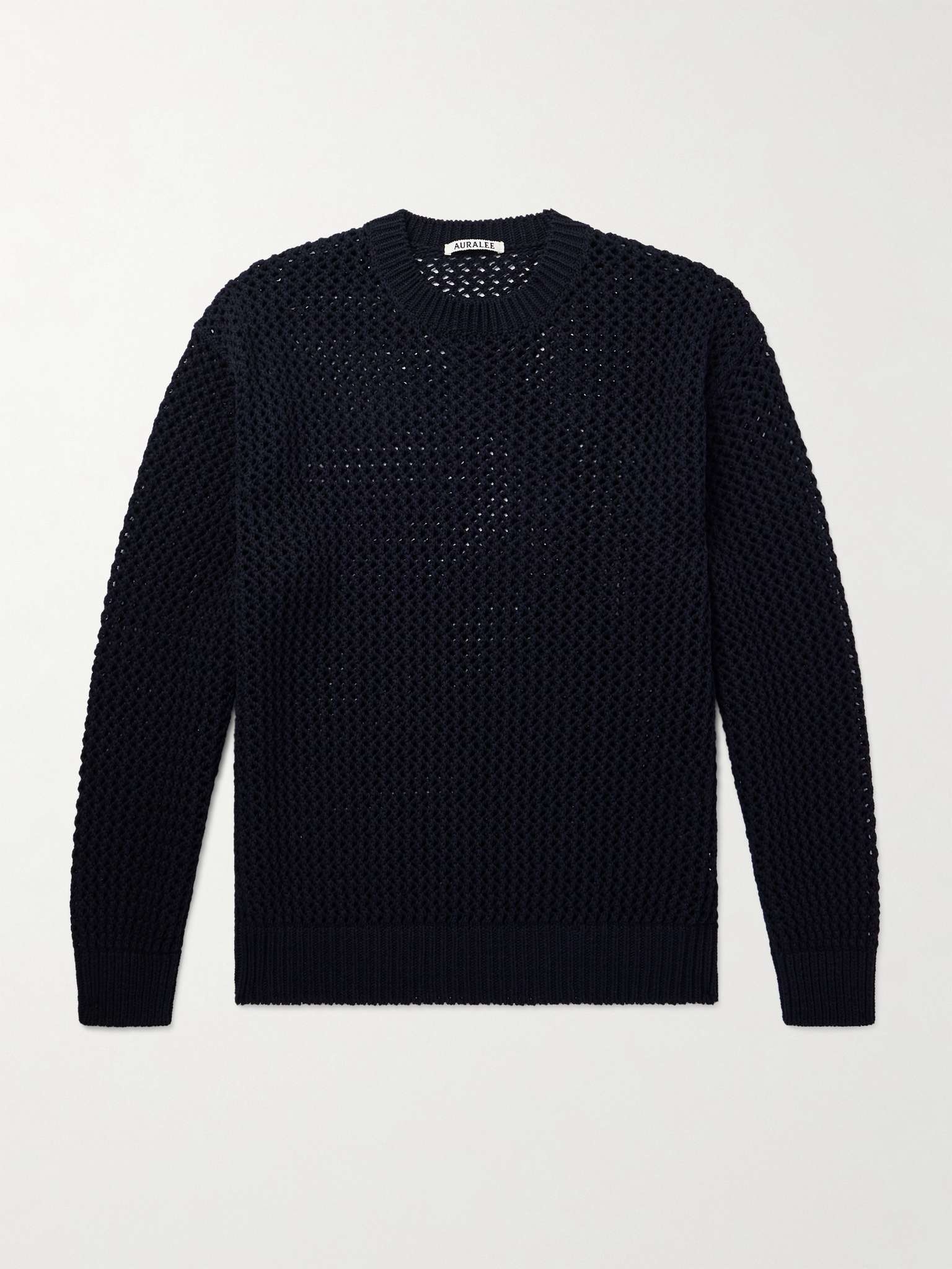 Auralee's sweater is made from textured cotton yarn that's knitted using a hand-flat machine to create its mesh-like finish. It has a loose fit that's enhanced by pooling sleeves and gently dropped shoulders. Style it layered over a tonal or contrasting tank to highlight the open stitch. Size & Fit - Size 3 = XS, 4 = S, 5 = M - Fits true to size. Take your normal size - Designed for a loose fit - Lightweight, open knit - Model is shown wearing a 5 - Model measures: chest 38"/ 96cm, height 6'1"/ 185cm Details & Care - Navy cotton - 100% cotton - Hand wash