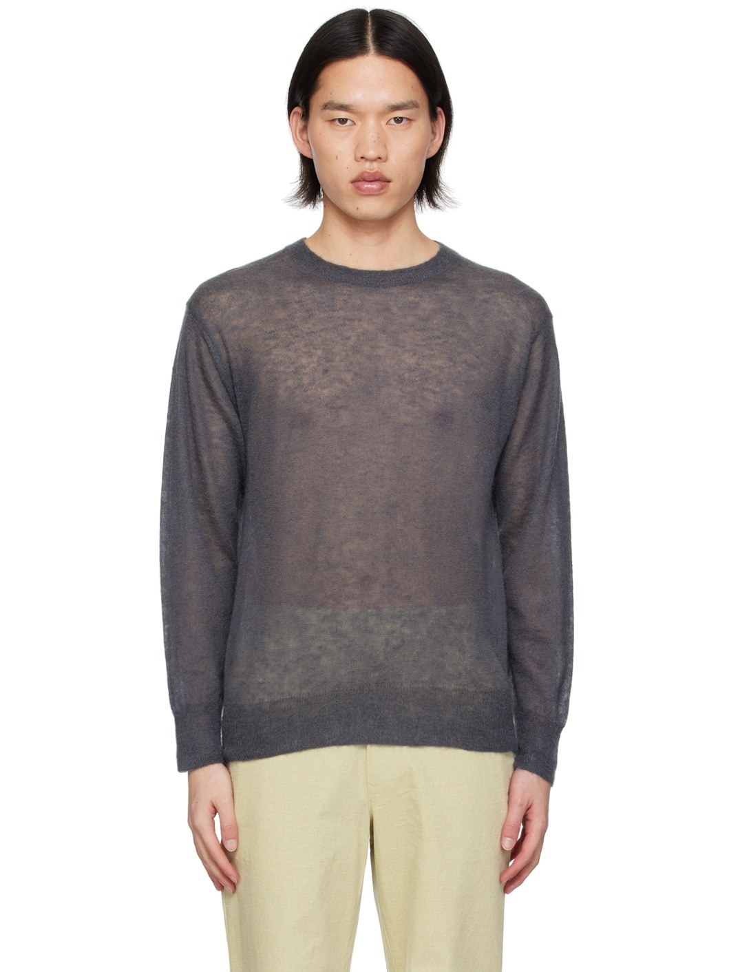 Semi-sheer knit mohair- and nylon-blend sweater. Rib knit crewneck, hem, and cuffs. Supplier color: Dark gray