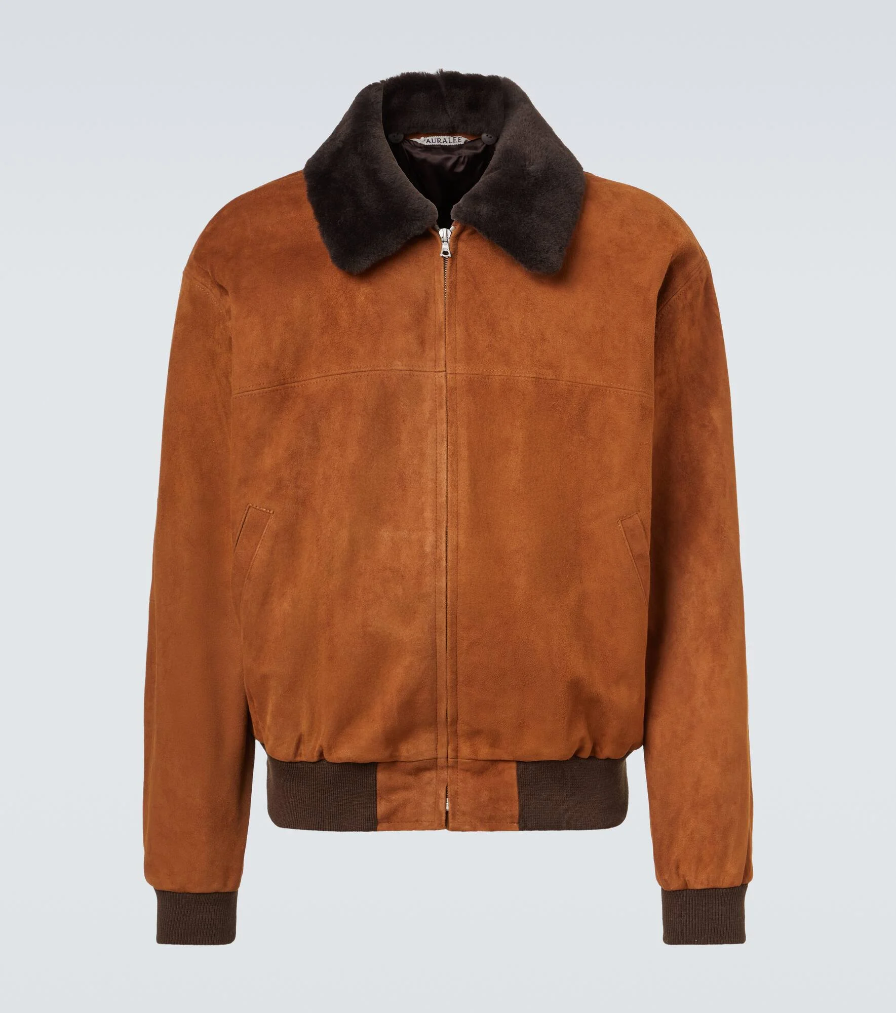 This aviator jacket from Auralee is crafted from soft suede and features a contrasting shearling collar. The piece is complete with zipped front closure, a ribbed hem, and welt pockets. Product Details - Material: 100% goat leather (suede) - Care instructions: specialist clean - Made in China - Designer color name: Camel Brown - Item color: brown - Lining: 100% cupro - Material II: 60% acrylic, 40% wool - Trim: 100% shearling - Hardware color: silver - Detachable trim - Cuff: ribbed - Pockets: welt pockets - Closure: zipped front - Hem: ribbed - Item number: P01069142 Size & Fit - True to size - Dropped shoulders - Straight fit - Elasticated hem - Non-stretchy fabric - Falls to the hip - Height of model is %cm%cm-%inch%" and wears a size 5