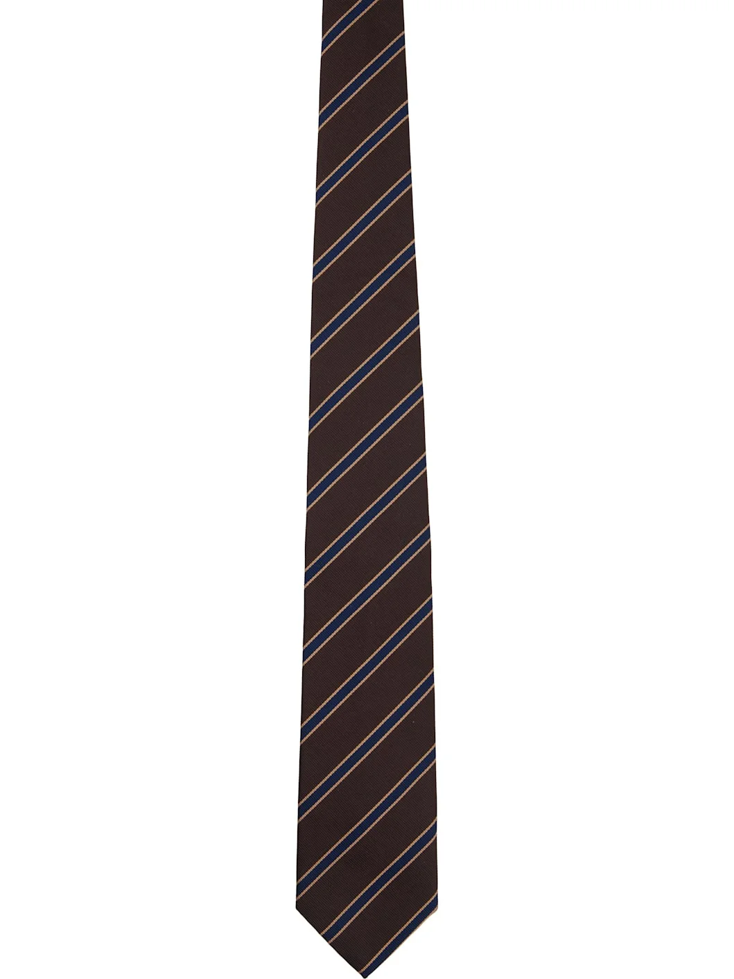 Silk twill tie. · Stripes throughout · Keeper loop at back face · W3" Supplier color: Dark brown stripe 100% silk. Made in Japan 252484M158005