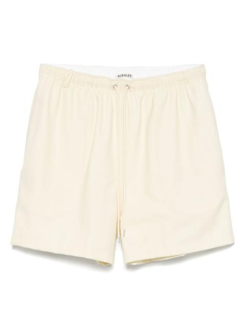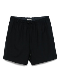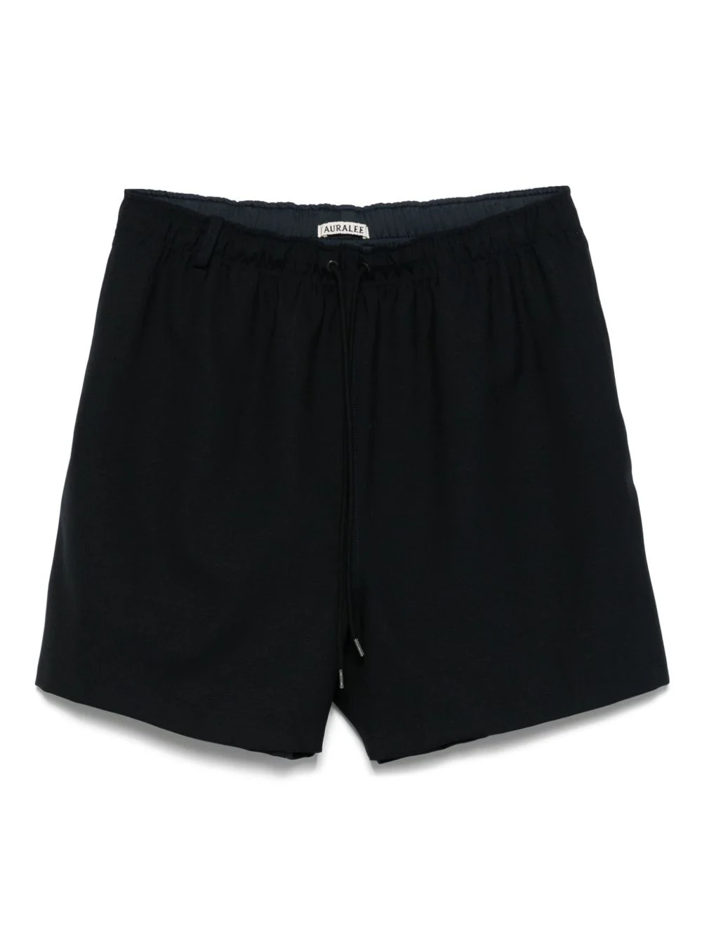 wool-blend shorts Highlights - Navy blue - Elasticated drawstring waistband - Belt loops - Two side slit pockets - Rear flap pocket Imported Composition Outer: Wool 90%, Mohair 10% Lining: Polyester 92%, Polyurethane 8%