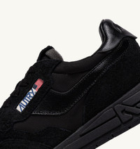 Innovative, light and extremely flexible, Reelwind Autry sneakers draw inspiration from the running world. The men’s style is crafted from a mix of suede and black ripstop nylon, with side panels in leather. Note the monochromatic upper with tone-on-tone details and sole, with the side logo standing out to add that touch of authenticity. Designed for a dynamic lifestyle, it features a slender silhouette and performance construction that ensures maximum freedom of movement. The rubber sole with an embossed tread is personalized with the A-arrow that offers a graphic and modern reinterpretation of the logo. SPECIFICATIONS: - Upper in nylon, suede, and leather. - Flat laces in cotton. - Embroidery label detailing seamed at the tongue. - Padded collar. - Leather and cotton terry lining. - 2 cm-high raised sockliner in leather. - Color matching rubber sole. - Height of sole: 2.5-3.5 cm. - Personalized shoe bag in fabric. COMPOSITIONS: Upper: 20% leather, 25% suede, 55% nylon Lining: 40% leather, 50% cotton terry, 10% nylon Sole: 60% Phylon, 40% rubber
