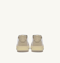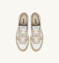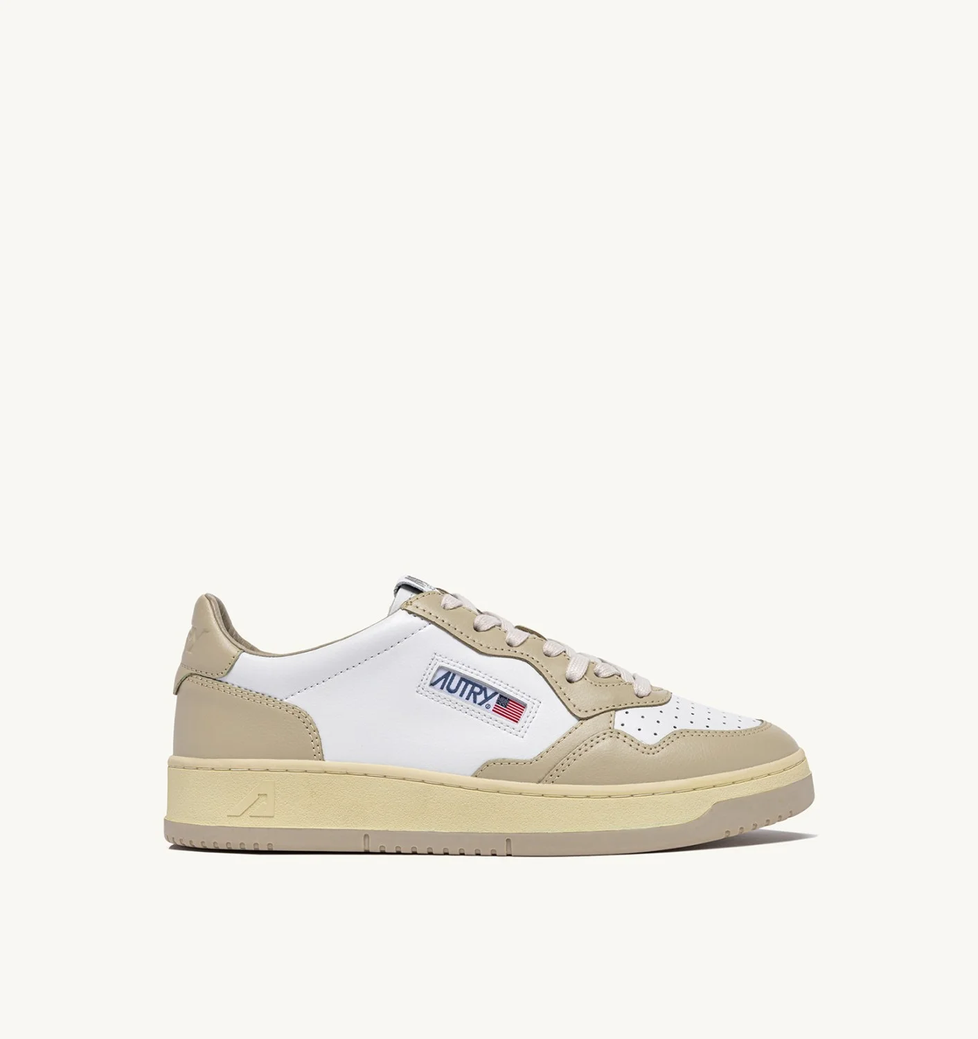 A classic Medalist sneakers featuring bold color combinations that exude strong personality. This men’s style stays true to the spirit of the original Autry, inspired by 1980s tennis, while updating it with streetwear proportions for a fresh experience of style and comfort. Crafted from soft, authentic leather, it features a bold color-block design in white and beige, paired with a natural rubber sole and beige tread that complements the rhythm of your steps. SPECIFICATIONS: - Color-block leather upper. - Micro-perforated toe. - Flat laces in cotton. - Embroidery label detailing seamed at the tongue. - Padded collar. - Leather and cotton terry lining. - 2 cm-high raised sockliner in leather. - Sole in rubber with contrast tread. - Height of sole: 2.5-3.5 cm. - Personalized shoe bag in fabric. SPECIFICATIONS: Upper: 100% leather Lining: 40% leather, 50% cotton terry, 10% nylon Sole: 100% rubber