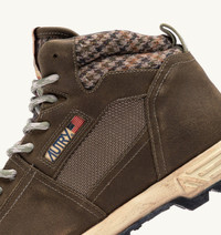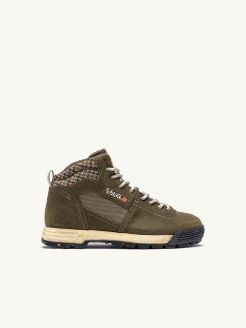 Malga is the new Winter Boot style designed by Autry. With its alpine heritage and retro vibe, this design celebrates outdoor adventures, snow sports, and the apres-ski lifestyle, offering a distinctive, stylish aesthetic. This lace-up pedula boot features a rugged sole with a lug tread and is equipped with a comfortable Alpha Skin membrane—waterproof, breathable, and windproof. The upper is crafted from hunter green nubuck leather with tone-on-tone mesh side panels and tongue, while the ankle collar comes in Houndstooth print fabric. The laces are two-tone and tubular, designed to ensure maximum durability. Branded details on the heel, tongue, and sides, along with the shoe model name, add an unmistakable touch of authenticity, while the reinforced heel provides superior protection. SPECIFICATIONS: - Upper in mesh and nubuck leather. - Tubular top laces. - Logo label seamed at the tongue. - Padded collar. - Leather and cotton terry lining. - Reinforced heel. - 2 cm-high raised sockliner in leather. - Rubber sole. - Height of sole: 2.5-3.5 cm. - Personalized shoe bag in fabric. COMPOSITIONS: Upper: 63% leather, 10% mesh, 27% polyester Lining: 40% leather, 60% cotton terry with waterproof membrane Sole: 60% Phylon, 40% rubber