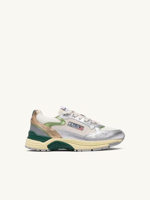 Hyperway: the Autry sneakers inspired by the future. Running style meets urban inspiration with the new Action Cush technology for maximum comfort. The upper stands out for its combination of three materials. The lightweight, breathable mesh ensures comfort, while the goatskin—known for its softness and durability—adds durability and a touch of sophistication. The addition of laminated leather brings a sophisticated, modern touch to the design. The sole features 'Action Cush' technology, delivering enhanced cushioning and optimal comfort for a uniquely smooth and enjoyable movement experience. The TPR stabilizer, strategically placed, provides support and stability. The nylon tongue adds a functional yet refined touch, while the embossed leather back counter, the jacquard fabric label at the tongue, and the side logo bring an extra layer of authenticity. SPECIFICATIONS: - Goatskin, laminated leather and mesh upper. - Mesh toe. - Flat cotton laces. - Jacquard logo label. - Padded collar in mesh. - Cotton terry lining. - 1.5 mm high mesh-lined sockliner. - PI sole. - Height of sole: 3.5 cm. - Personalized dust bag in nylon. COMPOSITIONS: Upper: 78%, 22% fabric (100% polyester) Lining: 50% cotton terry, 10% nylon, 5% leather, 35% mesh Sole: 40% Phylon, 20% TPU, 40% rubber
