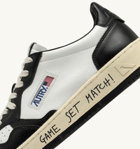 Elevate your daily outfits with Autry's ever-popular Medalist. This men's sneakers features a white leather upper, punctuated with black inserts that lend the 80s-inspired design a graphic, confident touch. The comfortable rubber sole captures the atmosphere of a tennis court with cool "Game Set Match!" handwritten lettering. SPECIFICATIONS: - Leather upper. - Perforated toe. - Flat cotton laces. - Label sewn on tongue. - Padded ankle collar. - Pigskin, towel and nylon lining. - 2 cm leather insole. - Rubber sole. - Height of sole: 2.5-3.5 cm. - Fabric dust bag. COMPOSITION: Upper Material: 100% cow leather Lining:: 40% pigskin, 50% towel, 10% nylon Outsole: 100% rubber