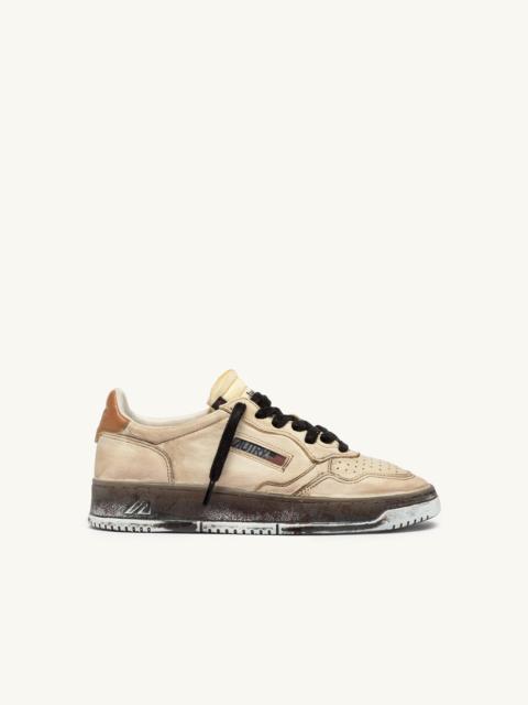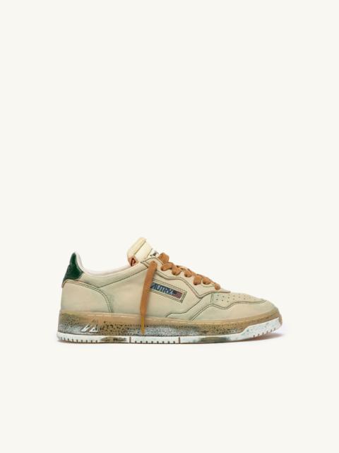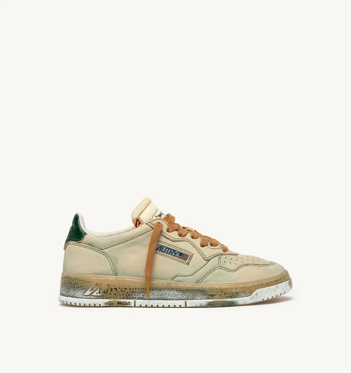 Medalist Super Vintage sneakers are the most authentic expression of Autry. This tennis-inspired design is comfortable and cozy, thanks to the high-quality materials used, while the 1980s vibe is enhanced by artisanal treatments that create a used, irregular, and unique look for each pair. This sneakers is crafted from beige smooth leather with lived-in effect green hues. The side insert draws attention to the jacquard Autry logo. Note the peculiar sole and the logoed heel tab. The exclusive treatment used to create the vintage look is entirely Made in Italy. SPECIFICATIONS: - Leather upper with a handcrafted used finish. - Micro-perforated toe. - Cotton laces. - Logo print on the tongue. - Padded collar. - Leather and cotton terry lining. - 2 cm-high raised sockliner in leather. - Rubber sole. - Height of sole: 2.5-3.5 cm. - Personalized shoe bag in fabric. COMPOSITIONS: Upper: 85% goatskin, 10% dragon mesh, 5%leather Lining: 35% leather, 50% cotton terry, 10% nylon, 5% mesh Sole: 100% rubber