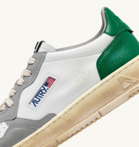 Medalist Super Vintage sneakers are the most authentic expression of Autry. This tennis-inspired design is comfortable and cozy, thanks to the high-quality materials used, while the 1980s vibe is enhanced by artisanal treatments that create a used, irregular, and unique look for each pair. These men's athletic shoes are made from soft leather with a lived-in appearance in white, gray and green tones. The side insert draws attention to the distinctive Autry logo. The exclusive treatment used to create the vintage look is entirely Made in Italy. SPECIFICATIONS: - Leather upper with artisanal used treatment. - Micro-perforated toe. - Used-effect cotton laces. - Embroidery label detailing seamed at the tongue. - Padded collar. - Leather and cotton terry lining. - 2-cm raised sockliner in leather. - Outsole in rubber in the same color as the upper. - Height of sole: 2.5-3.5 cm. - Personalize shoe bag in fabric. COMPOSITION: Upper: 100% leather Lining: 40% leather; 50% cotton terry; 10% nylon Sole: 100% rubber