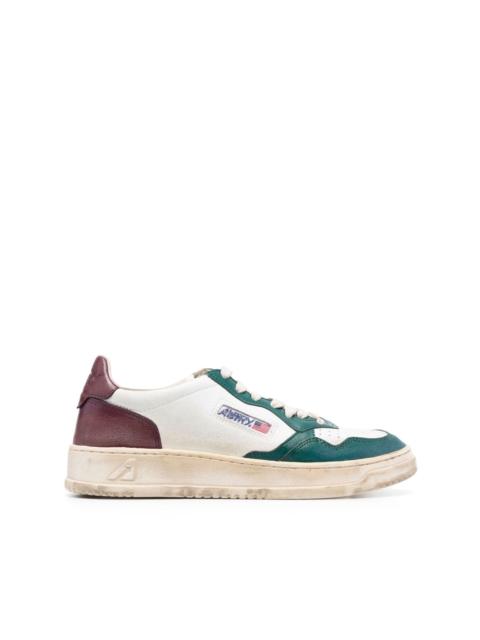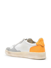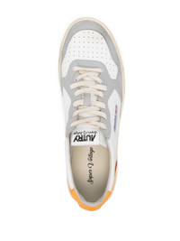 Medalist Super Vintage leather sneakers Autry's Medalist Low sneakers are a re-release of an original '80s design. This white, grey and orange Super Vintage pair takes its name from the distressed finish, which is achieved at the hands of master craftsmen using innovative techniques. They’re made from colour-blocked panels of smooth leather with signature American flag logos that honour the brand’s roots. Highlights - White/grey/orange - Calf leather - Panelled design - Distressed effect - Round toe - Perforated toebox - Logo patch at the tongue - Embroidered logo to the side - Contrasting branded heel counter - Branded leather insole - Flat rubber sole - Front lace-up fastening Imported Composition Outer: Calf Leather 100% Sole: Rubber 100% Lining: Calf Leather 100%, Fabric 100% SIZE & FIT Measurement HEEL 1.57 in(4 cm) Sole height 0.98 in(2.5 cm)