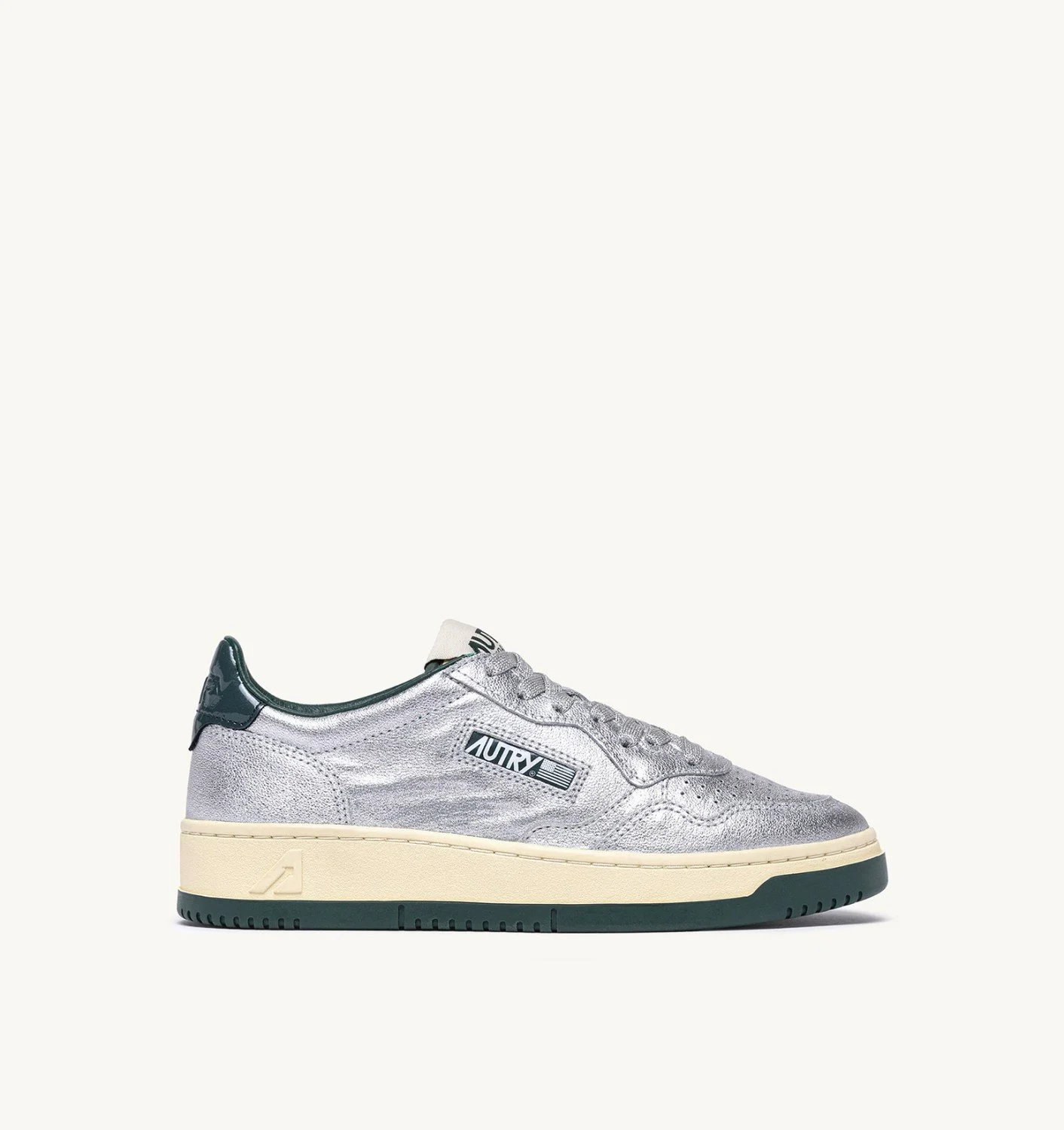 This Medalist sneakers is the quintessential everyday essential with Autry's typical attitude. The design combines 1980s tennis inspiration with premium materials and dynamic shapes, offering versatility for various looks while ensuring excellent comfort. This men’s sneakers is crafted from metalized silver leather, finished with micro-perforations at the toe for excellent breathability. Details on the outer side and heel are made of patent green leather and personalized with the Autry logo, adding a touch of genuine originality. SPECIFICATIONS: - Upper in leather. - Micro-perforated toe. - Flat laces in cotton. - Embroidery label detailing seamed at the tongue. - Padded collar. - Leather and cotton terry lining. - 2 cm-high raised sockliner in leather. - Rubber sole. - Height of sole: 2.5-3.5 cm. - Personalized shoe bag in fabric. COMPOSITIONS: Upper: 90% leather, 10% nylon Lining: 40% leather, 50% cotton terry, 10% nylon Sole: 100% rubber