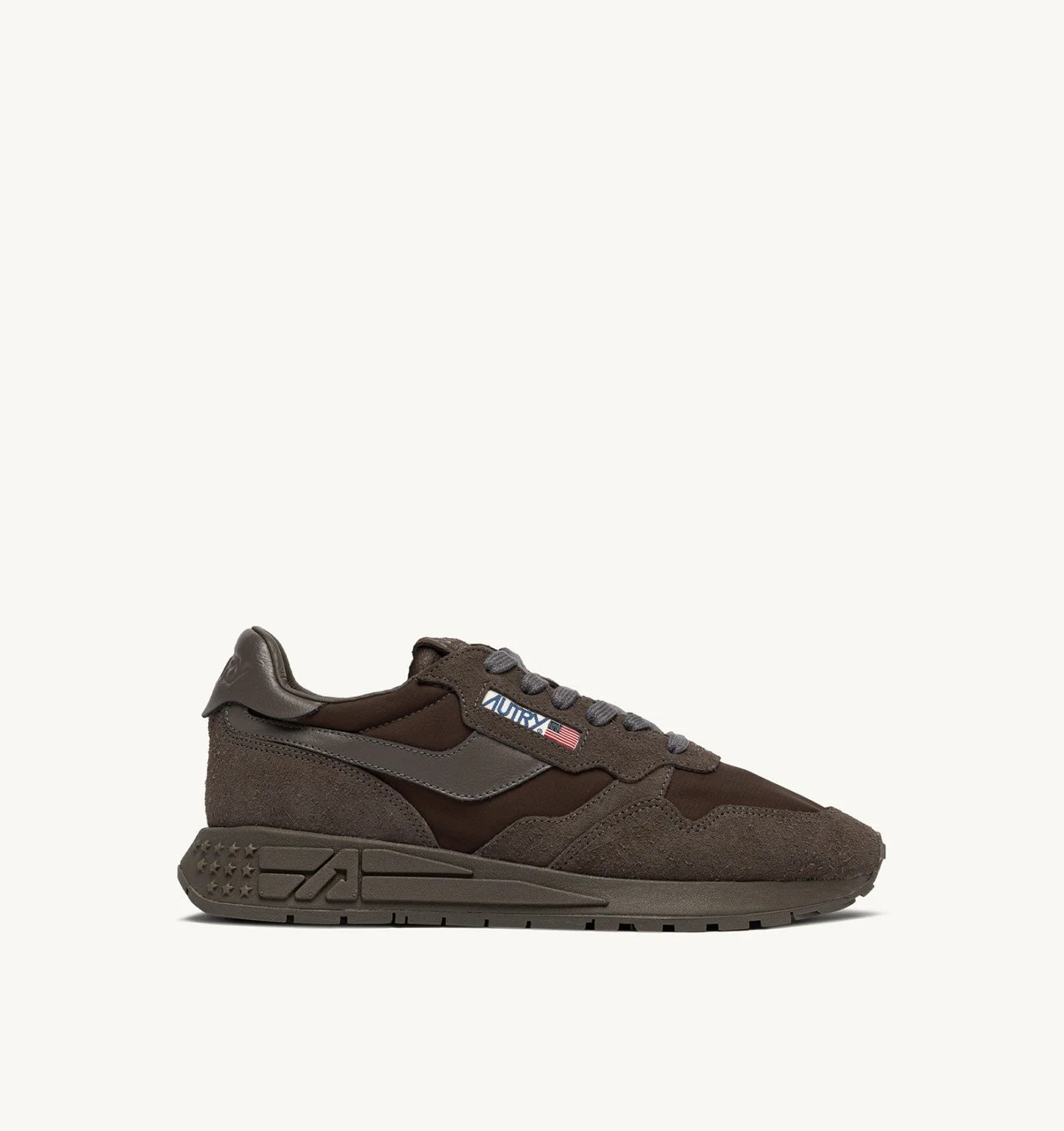 Innovative, light and extremely flexible, Reelwind Autry sneakers draw inspiration from the running world. The men’s style is crafted from a mix of suede and brown ripstop nylon, with side panels in leather. Note the monochromatic upper with tone-on-tone details and sole, with the side logo standing out to add that touch of authenticity. Designed for a dynamic lifestyle, it features a slender silhouette and performance construction that ensures maximum freedom of movement. The rubber sole with an embossed tread is personalized with the A-arrow that offers a graphic and modern reinterpretation of the logo. SPECIFICATIONS: - Upper in nylon, suede, and leather. - Flat laces in cotton. - Embroidery label detailing seamed at the tongue. - Padded collar. - Leather and cotton terry lining. - 2 cm-high raised sockliner in leather. - Color matching rubber sole. - Height of sole: 2.5-3.5 cm. - Personalized shoe bag in fabric. COMPOSITIONS: Upper: 20% leather, 25% suede, 55% nylon Lining: 40% leather, 50% cotton terry, 10% nylon Sole: 60% Phylon, 40% rubber