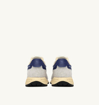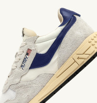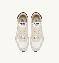 Reelwind sneakers blend Autry’s signature style with elements inspired by the world of running. Featuring a sleek silhouette and an ’80s-inspired retro design, they offer lightness, flexibility, and optimal grip. This version creates original color-block combinations, adding a bold twist to any look. The women's style is crafted from a mix of white suede and nylon, with side panels in blue leather. Designed for a dynamic lifestyle, it features a slender silhouette and performance construction that ensures maximum freedom of movement. The rubber sole with an embossed tread is personalized with a star pattern and an A-arrow that offers a graphic and modern reinterpretation of the logo. SPECIFICATIONS: - Upper in nylon, suede, and mesh. - Mesh toe. - Flat cotton laces. - Label detailing at tongue. - Padded ankle collar. - Nylon, leather and cotton terry lining. - 2cm-high raised sockliner in leather. - Running sole. - Height of sole: 2.5-3.5 cm. - Personalized shoe bag in fabric. COMPOSITION: Upper: 50% nylon, 40% leather, 10% mesh Lining: 40% leather, 50% cotton terry, 10% nylon Sole: 60% Phylon, 40% rubber