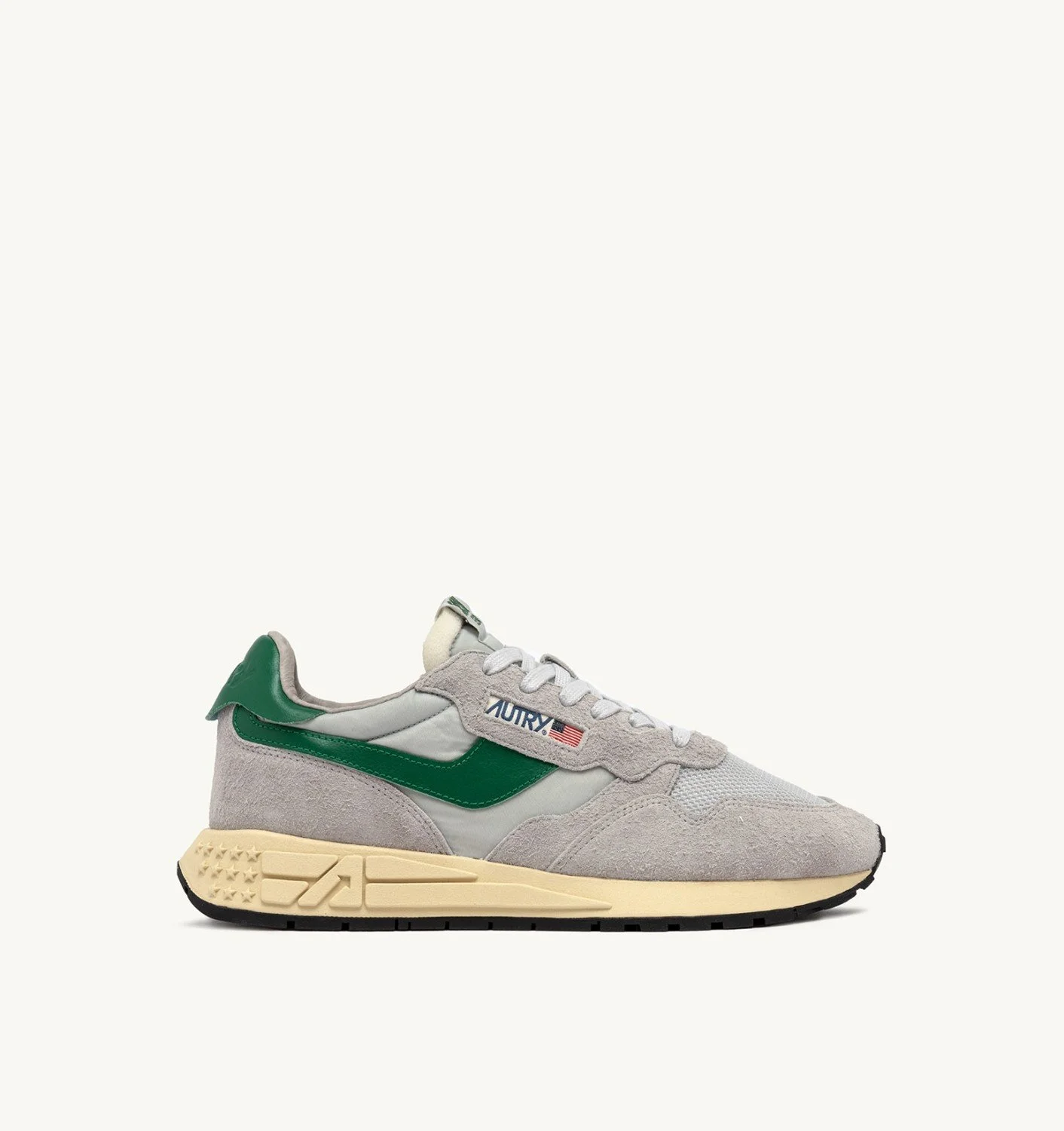 Innovative, light and extremely flexible, Reelwind Autry sneakers draw inspiration from the running world. The men's style is crafted from a mix of beige suede and nylon, with side panels in green leather. Designed for a dynamic lifestyle, it features a slender silhouette and performance construction that ensures maximum freedom of movement. The rubber sole with an embossed tread is personalized with a star pattern and an A-arrow that offers a graphic and modern reinterpretation of the logo. SPECIFICATIONS: - Upper in nylon, suede, and mesh. - Mesh toe. - Flat cotton laces. - Label detailing at tongue. - Padded collar. - Nylon, leather and cotton terry lining. - 2-cm raised sockliner in leather. - Running outsole. - Height of sole: 2.5-3.5 cm. - Personalize shoe bag in fabric. COMPOSITION: Upper: 50% nylon, 40% leather, 10% mesh Lining: 40% leather, 50% cotton terry, 10% nylon Sole: 60% Phylon, 40% rubber