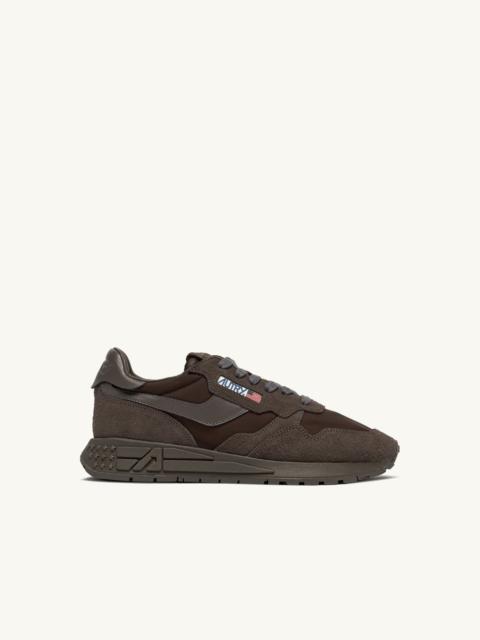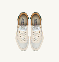 Reelwind sneakers offer the technical edge of a performance shoe with the unmistakable style of the Autry aesthetic. This men's athletic shoe is crafted from reflective gray nylon in silver tones and is reinforced by beige suede and green leather inserts that create a dynamic design. Lightweight and streamlined, it is completed by a rubber and Phylon running sole that softens the impact on the road or on the pitch. SPECIFICATIONS: - Upper in leather, suede, nylon and mesh. - Mesh toe. - Flat cotton laces. - Embroidery label detailing seamed at the tongue. - Padded collar. - Leather, terry and nylon lining. - 2-cm raised sockliner in leather. - Rubber sole. - Height of sole: 2.5-3.5 cm. - Personalize shoe bag in fabric. COMPOSITION: Upper Material: 10% cracked cow leather, 30% suede, 5% cow leather, 40% nylon, 15% mesh Lining: 40% leather, 50% cotton terry, 10% nylon Sole: 60% Phylon, 40% rubber