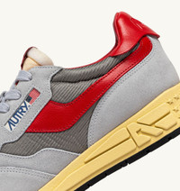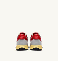 Innovative, light and extremely flexible, Reelwind Autry sneakers draw inspiration from the running world. The men’s style is crafted from a mix of suede and gray ribbed mesh, with side panels in red leather. Designed for a dynamic lifestyle, it features a slender silhouette and performance construction that ensures maximum freedom of movement. The rubber sole with an embossed tread is personalized with a star pattern and an A-arrow that offers a graphic and modern reinterpretation of the logo. SPECIFICATIONS: - Upper in leather, ribbed fabric and suede. - Flat laces in cotton. - Label detailing at tongue. - Padded collar. - Leather, nylon and cotton terry lining. - 2 cm-high raised sockliner in leather. - Running sole. - Height of sole: 2.5-3.5 cm. - Personalized shoe bag in fabric. COMPOSITIONS: Upper: 20% leather, 25% suede, 15% mesh, 40% nylon Lining: 40% leather, 50% cotton terry, 10% nylon Sole: 60% Phylon, 40% rubber