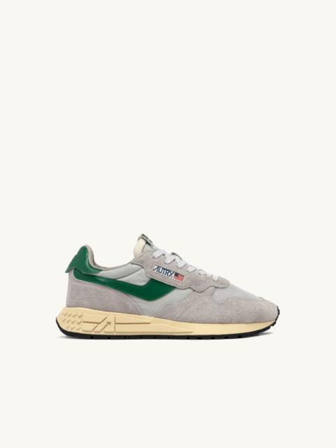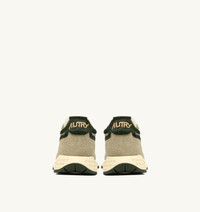 Reelwind sneakers blend Autry’s signature style with elements inspired by the world of running. Featuring a sleek silhouette and an ’80s-inspired retro design, they offer lightness, flexibility, and optimal grip. The men's version is crafted from beige suede and nylon with green pony skin-effect side inserts. Designed for a dynamic lifestyle, it features a performance-driven construction that ensures maximum freedom of movement. The rubber sole with an embossed tread is personalized with a star pattern and an A-arrow that offers a graphic and modern reinterpretation of the logo. SPECIFICATIONS: - Suede and nylon upper. - Flat cotton laces. - Label detailing at tongue. - Padded ankle collar. - Leather, nylon and cotton terry lining. - 2 cm-high raised sockliner in leather. - Running sole. - Height of sole: 2.5-3.5 cm. - Personalized shoe bag in fabric. COMPOSITION: Upper: 60% nylon, 40% leather Lining: 40% leather, 50% cotton terry, 10% nylon Sole: 60% Phylon, 40% rubber