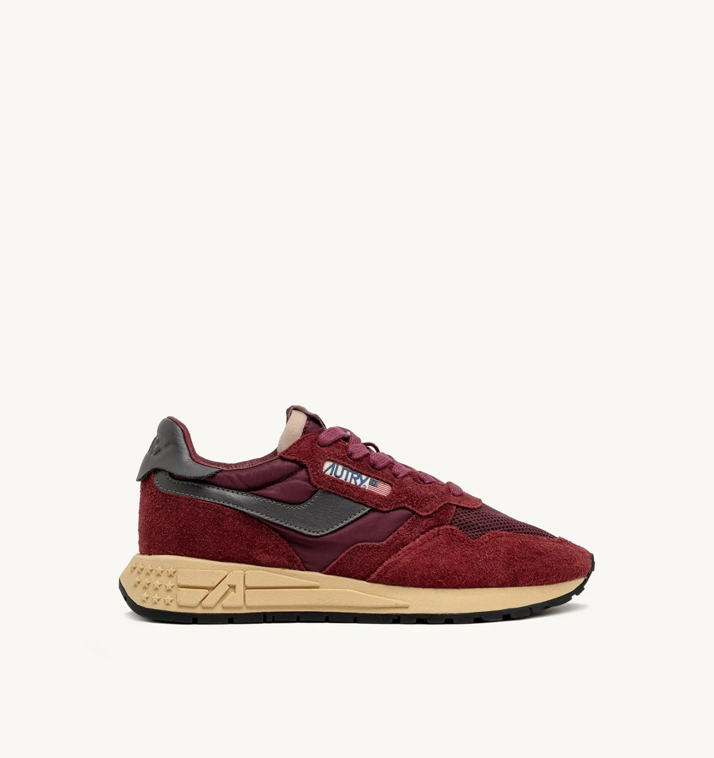 Reelwind low sneakers offer the technical edge of a performance sports shoe with the unmistakable style of the Autry aesthetic. This men’s athletic shoe is crafted from burgundy nylon and is reinforced by inserts in color matching suede and gray leather that create a refined design. Light and streamlined, it is finished with a mesh toe and a running sole made of rubber and Phylon that absorbs impact on the road or field. Details on the tongue, outer side, and heel are personalized with the Autry logo, adding a touch of authenticity for a contemporary everyday aesthetic. SPECIFICATIONS: - Upper in leather, suede, nylon and mesh. - Mesh toe. - Flat laces in cotton. - Embroidery label detailing seamed at the tongue. - Padded collar. - Leather, terry and nylon lining. - 2 cm-high raised sockliner in leather. - Rubber sole. - Height of sole: 2.5-3.5 cm. - Personalized shoe bag in fabric. COMPOSITIONS: Upper: 20% leather, 25% suede, 40% nylon, 15% mesh Lining: 40% leather, 50% cotton terry, 10% nylon Sole: 60% Phylon, 40% rubber