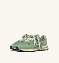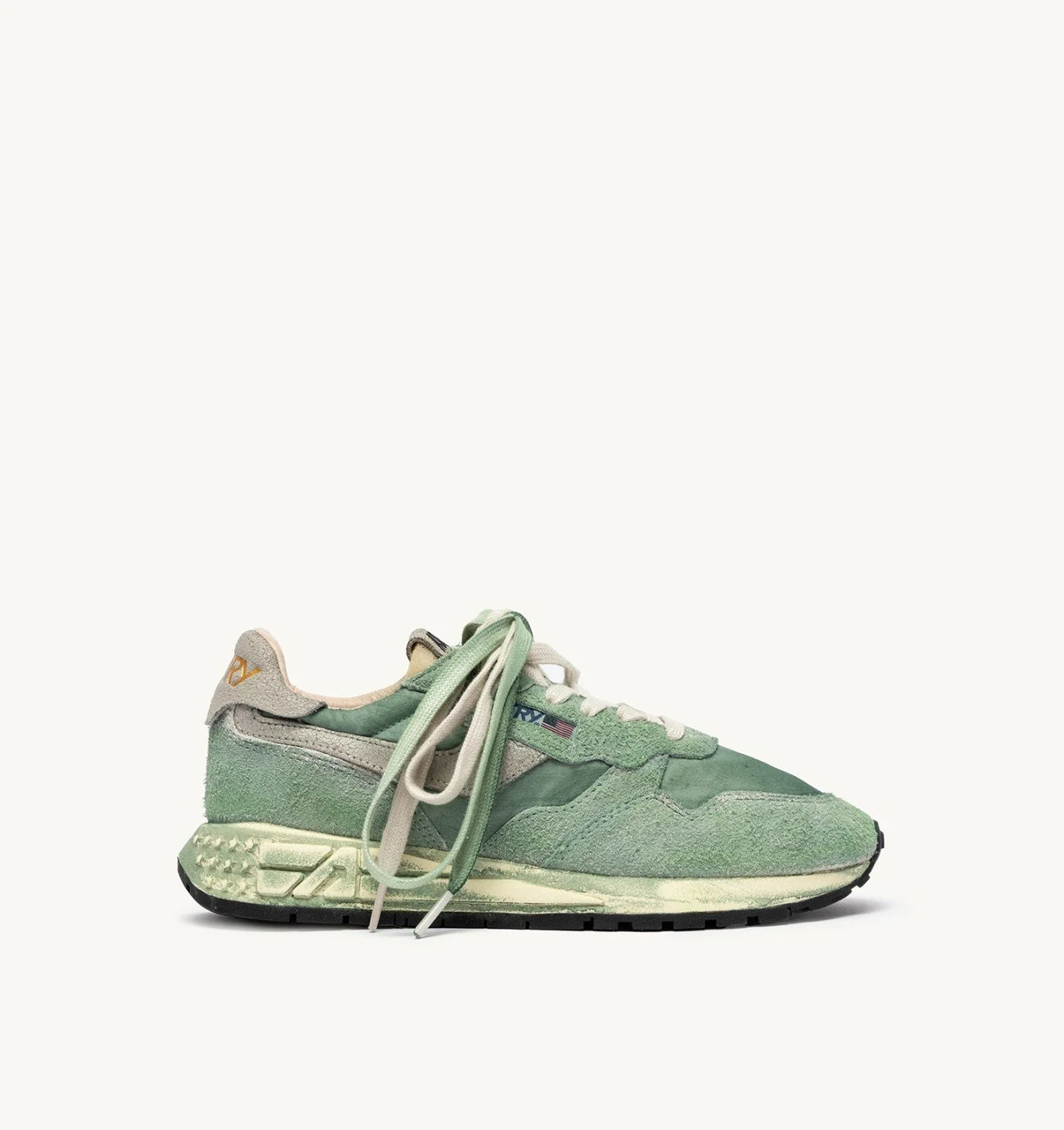 Innovative, light, and extremely flexible, Reelwind draws inspiration from the running world, enhanced by artisanal treatments that give each style a distinct, irregular, and unique used appearance. This model is crafted from a mix of hunter green suede and nylon with side overlays in gray crackle-effect leather. Designed for a dynamic lifestyle, it features a streamlined silhouette and performance construction that ensures maximum freedom of movement. The rubber sole with an embossed tread is personalized with a star pattern and an A-arrow that offers a graphic and modern reinterpretation of the logo. The double laces in different colors add a touch of originality. The exclusive treatment used to create the vintage look is entirely Made in Italy. SPECIFICATIONS: - Upper in nylon, suede, and crackle-effect leather. - Flat laces in cotton. - Label detailing at tongue. - Padded collar. - Leather, nylon and cotton terry lining. - 2 cm-high raised sockliner in leather. - Seamed running sole in rubber with relief logo. - Height of sole: 2.5-3.5 cm. - Personalized shoe bag in fabric. COMPOSITIONS: Upper: 40% leather, 60% nylon Lining: 40% leather, 50% cotton terry, 10% nylon Sole: 60% Phylon, 40% rubber