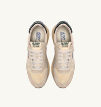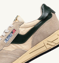 Reelwind low sneakers offer the technical edge of a performance sports shoe with the unmistakable style of the Autry aesthetic. This men’s athletic shoe is crafted from beige nylon and is reinforced by inserts in color matching suede and dark green leather that create a dynamic design. Light and streamlined, it is finished with a mesh toe and a running sole made of rubber and Phylon that absorbs impact on the road or field. Details on the tongue, outer side, and heel are personalized with the Autry logo, adding a touch of authenticity for a contemporary everyday aesthetic. SPECIFICATIONS: - Upper in leather, suede, nylon and mesh. - Mesh toe. - Flat laces in cotton. - Embroidery label detailing seamed at the tongue. - Padded collar. - Leather, terry and nylon lining. - 2 cm-high raised sockliner in leather. - Rubber sole. - Height of sole: 2.5-3.5 cm. - Personalized shoe bag in fabric. COMPOSITIONS: Upper: 20% leather, 25% suede, 40% nylon, 15% mesh Lining: 40% leather, 50% cotton terry, 10% nylon Sole: 60% Phylon, 40% rubber