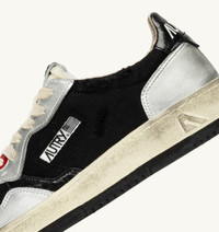 The boldest and most current street attitude is expressed with this men’s Medalist Super Vintage sneaker. This Autry sneakers is presented in white mesh with silver-tone suede inserts and crackle-effect black leather details. The special feature is the artisanal craftsmanship, designed and developed in Italy to create a unique, irregular used look for each pair. The high natural rubber sole is treated with dirty effects and finished with a black tread, emphasizing the graphic power of the design. SPECIFICATIONS: - Upper in crackle-effect leather, micro-mesh, and suede with a handcrafted used finish. - Used-effect cotton laces. - Embroidery label detailing seamed at the tongue. - Padded collar. - Leather and cotton terry lining. - 2 cm-high raised sockliner in leather. - Rubber sole. - Height of sole: 2.5-3.5 cm. - Personalized shoe bag in fabric. COMPOSITIONS: Upper: 45% mesh, 25% pearlized leather, 15% crackle-effect leather, 5% leather, 10% foam Lining: 40% leather, 50% cotton terry, 10% nylon Sole: 100% rubber