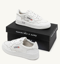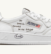 Autry Medalist reimagines 1980s tennis style, blending heritage vibes with a clean, modern aesthetic. Defined by its essential design, it’s the perfect everyday sneaker with timeless, versatile feel, delivering all-day comfort with a mix of classic style and functionality. Autry embraces Thomas Lelu’s mantra, “Do Small Things with Great Love,” celebrating the small gestures that hold the greatest emotions. In the limited-edition Thomas Lelu x Autry collaboration, the French writer, artist, and photographer lends his signature calligraphic style to the Medalist sneakers, transforming the Autry icon into a message of universal love, boundless positivity, and hope—an invitation to embrace the power of kindness. These sneakers come in full optical white, like a blank canvas, featuring the laser-engraved quote on the outer side of the right shoe and the Thomas Lelu x Autry signature on the inner side of the left shoe. SPECIFICATIONS: - Upper in goatskin. - Micro-perforated toe. - Flat cotton laces. - Embroidery label detailing seamed at the tongue. - Padded collar. - Leather and cotton terry lining. - 2 cm-high raised sockliner in leather. - Rubber sole. - Height of sole: 2.5-3.5 cm. - Personalized shoe bag in fabric. COMPOSITION: Upper: 100% goatskin Lining: 40% leather, 50% cotton terry, 10% nylon. Sole: 100% rubber