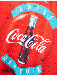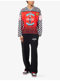 PRODUCT DETAILS - Awake NY x Coca Cola woven T-shirt - 100% polyester - Oversized, striped ribbed V-neck, long sleeves, patches at sleeves and back, brand patch and graphic print at front, all-over check print, all-over mesh texture - Wipe with a clean, dry cloth - Model is 6ft 2in/1.88m and wears a size medium - Lightweight, non-stretch Ref: R04574755