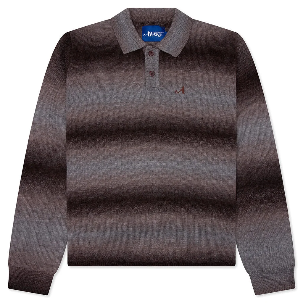 Awake NY introduces the Knit Polo in their latest collection. Made from a blend of polyester, acrylic, and wool, the knitted polo is cut to have a relaxed fit with a soft, warm feel. Adorned in a brown gradient, an embroidered 'A' sits on the chest for subtle branding. Finished with a two-button placket, ribbed knit collar, and cuffs for classic styling. - 50% Recycled Polyester, 45% Acrylic, 5% Wool - Polo collar - Two-button placket - Ribbed knit trims - Embroidered 'A' on chest - Style No: AWK-FW25-KN001-BRN