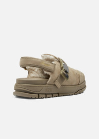 Just like the Area sneaker, the eponymous Area sandal pays homage to ‘90s basketball footwear. Handcrafted from suede, it’s fitted with a webbing slingback strap and custom buckle for a utilitarian finish. Style Details - Upper: 100% Suede - Lining: 95% Shearling Leather + 5% PU - Sole: 100% TR; height measures 37mm / 1.45" - European Sizing - Adjustable clip fastening - Adjustable velco back strap - Handmade in Portugal