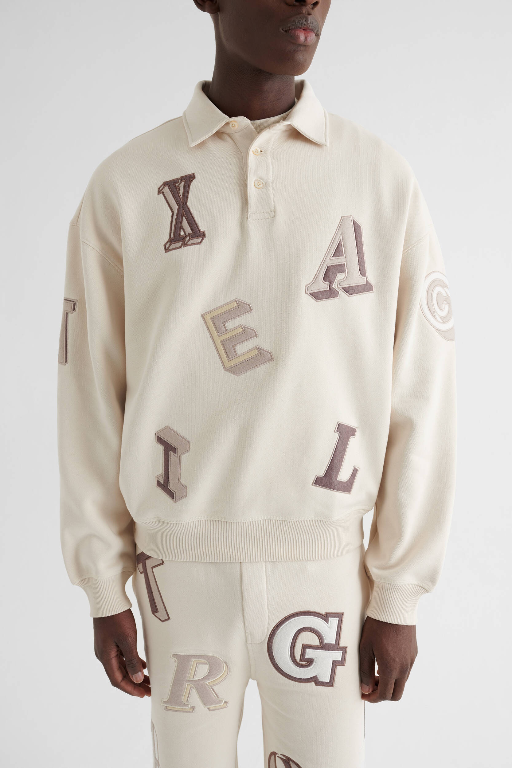 The Typo polo sweatshirt is cut from organic cotton that’s appliquéd with mismatched letter patches – each one is cut from two-tone felt. Unfasten the button placket to loosen up the collar. This sweatshirt is cut in a regular fit. The model is wearing a size M.