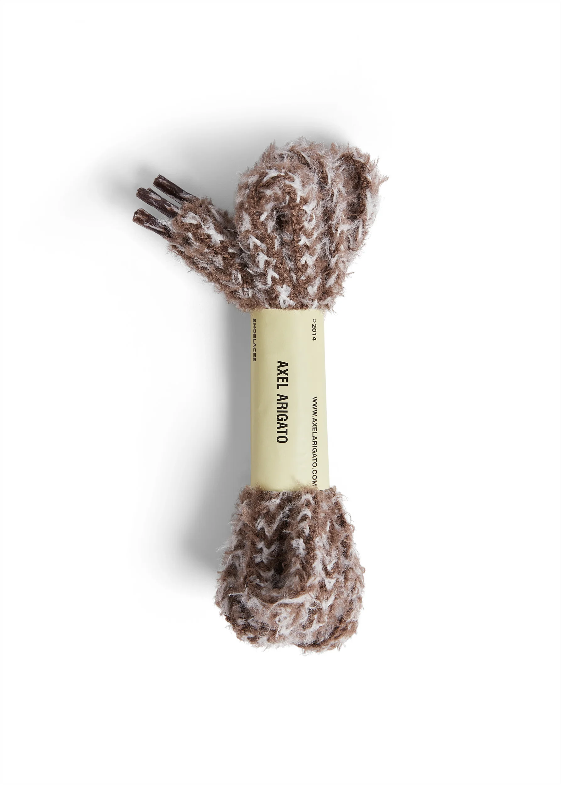 These fuzzy laces bring a soft, textured finish to your sneakers. Made in Portugal, their 12mm flat profile shows off a two tone pattern with a high-pile feel. At 125 cm, they’re a fun and easy way to personalise your Axel Arigato pair with more texture and character. We recommend 125 cm laces for sizes EU 35–41, and 135 cm for sizes EU 42–48. Style Details - Color: Brown/White - Comes in a pair. - Composition: 100% Polyester - Length measures: 125cm - Width measures: 12mm - Crafted in Portugal