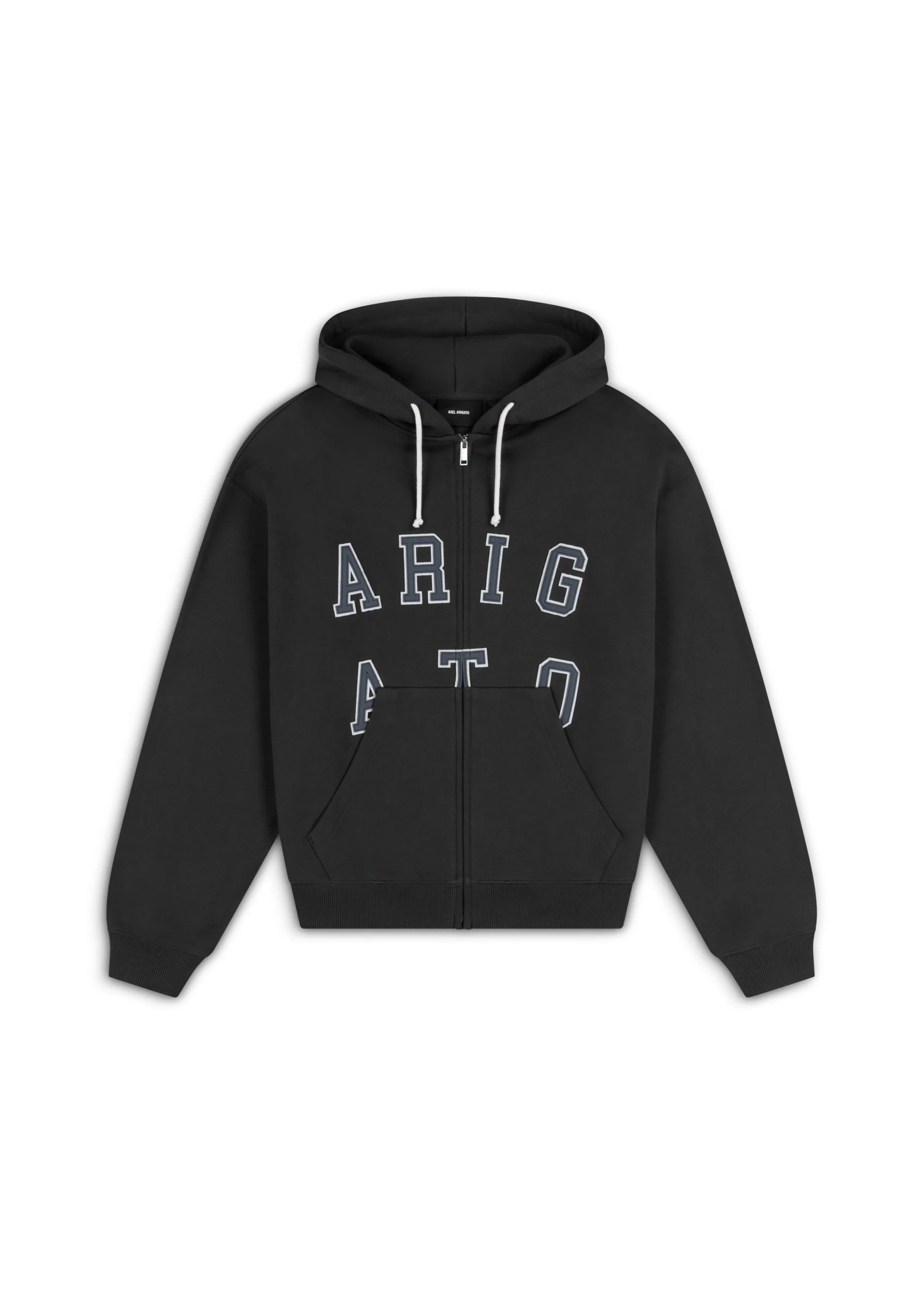 The oversized Legend hoodie is crafted from organic cotton in a comfortable, zip-up profile. Appliqued felt letters across the front spell out ‘Arigato’. The model is 185 cm / 6’1 ft and wears a size M.
