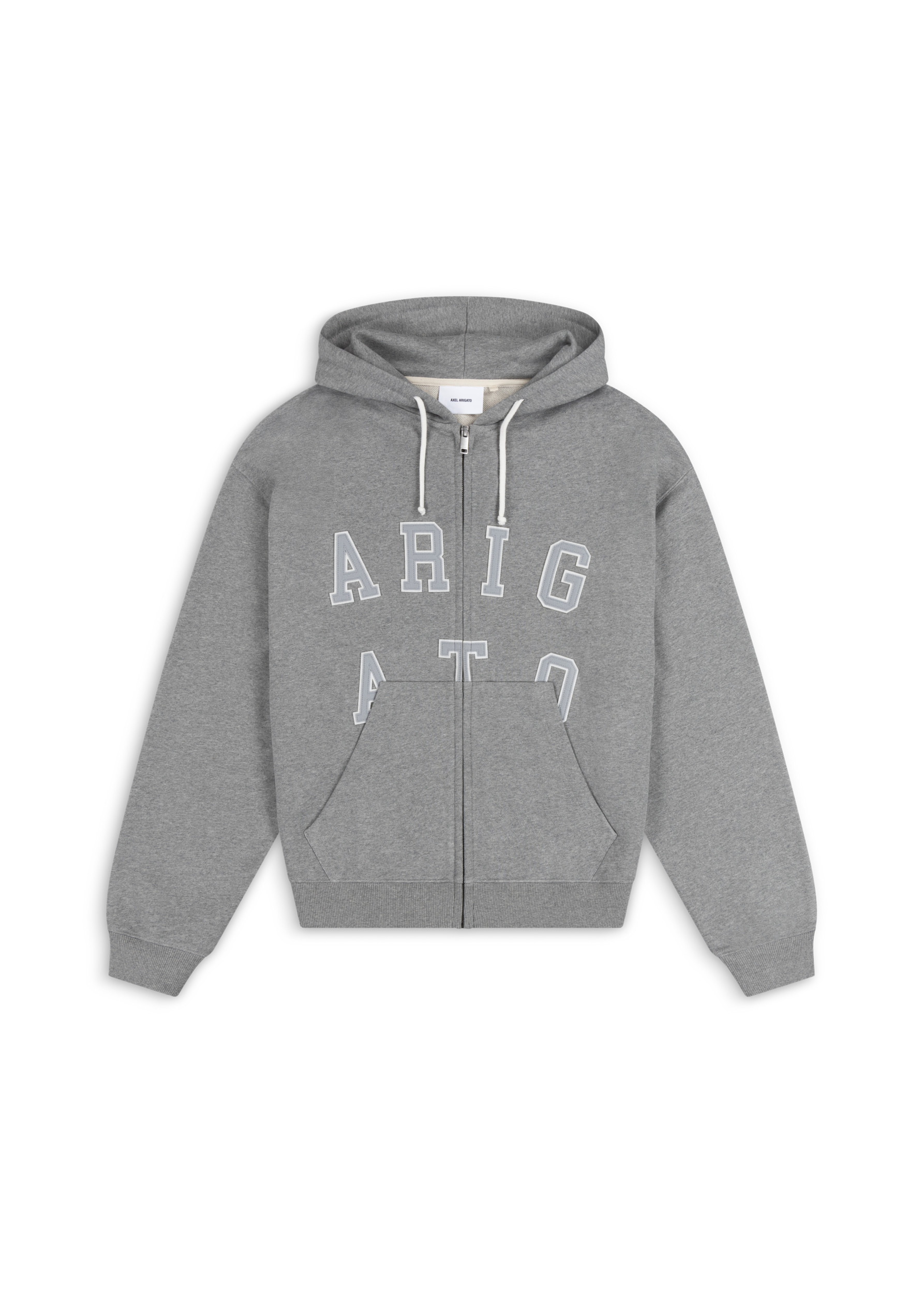 The oversized Legend hoodie is crafted from organic cotton in a comfortable, zip-up profile. Appliqued felt letters across the front spell out ‘Arigato’. The model is 185 cm / 6’1 ft and wears a size M.