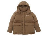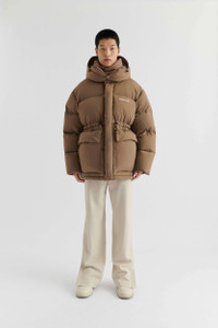 The quilted Nebraska parka is made from lightweight recycled polyester that’s filled with re-used down and feathers. Detailed with a screen-printed logo, it has a detachable hood, sizable pockets, and adjustable ties at the waist so you can personalize the fit. Scan the QR code on the label of this puffer jacket to trace its journey. This jacket is designed to be worn in the city, so it isn’t waterproof but only slightly water repellent. If you find yourself in a downpour, make sure to dry your jacket properly to avoid mold or stains. The model is 191 cm / 6'3 ft and wears a size M. Style Details - Main fabric: 100% Recycled Polyester - Filling material: 85% Re-Used Duck Down 15% Feather - 700 Fill power - Screen print - Padded placket with hidden press buttons and vislon zipper - Detatchable hood - Cut and sewn pockets - Comes with a bag in self fabric for easy packing and bringing - Dry clean only - Manufactured in China