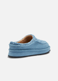 The Pillow mule has a bold, contemporary silhouette that draws from different elements of classic footwear styles. Designed with amplified proportions, it’s crafted in Portugal from Italian denim and features a distressed panel for textural contrast. Fluid piping and a supportive branded sole finish this pair. Style Details - Upper: 100% Cotton - Lining: 70% Microfibre, 30% Polyester - Sole: 80% EVA, 20% TPU - Height Measures 40mm - European Sizing - Italian Denim - Slip on - Wrapped midsole - Handcrafted in Portugal