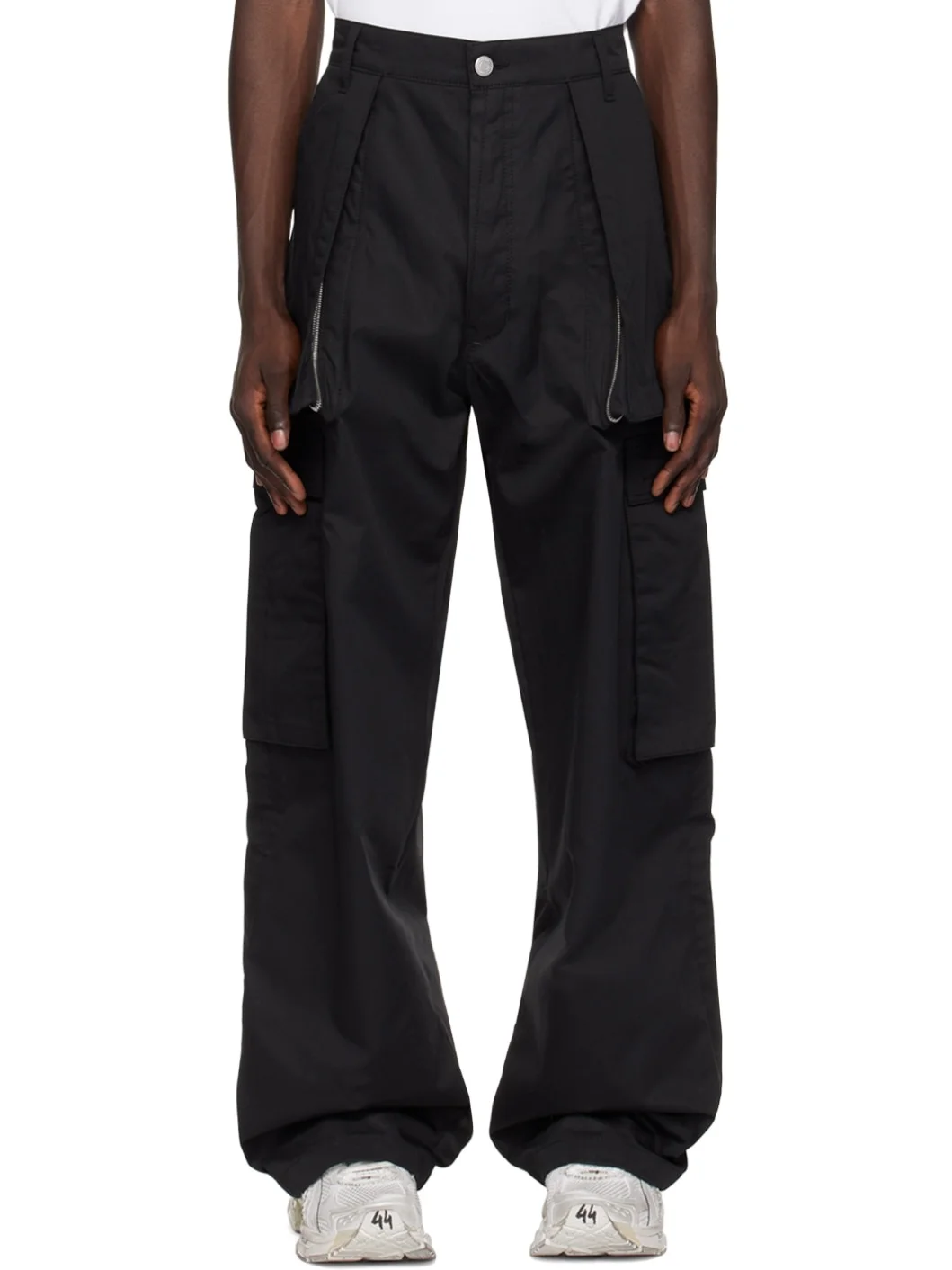 Cotton twill cargo pants. · Belt loops · Six-pocket styling · Button-fly · Cargo pocket at outseams · Offset back waistband · Locker loop at back · Logo patches at back leg Supplier color: Pelago black 100% cotton. Made in United States 241198M188000
