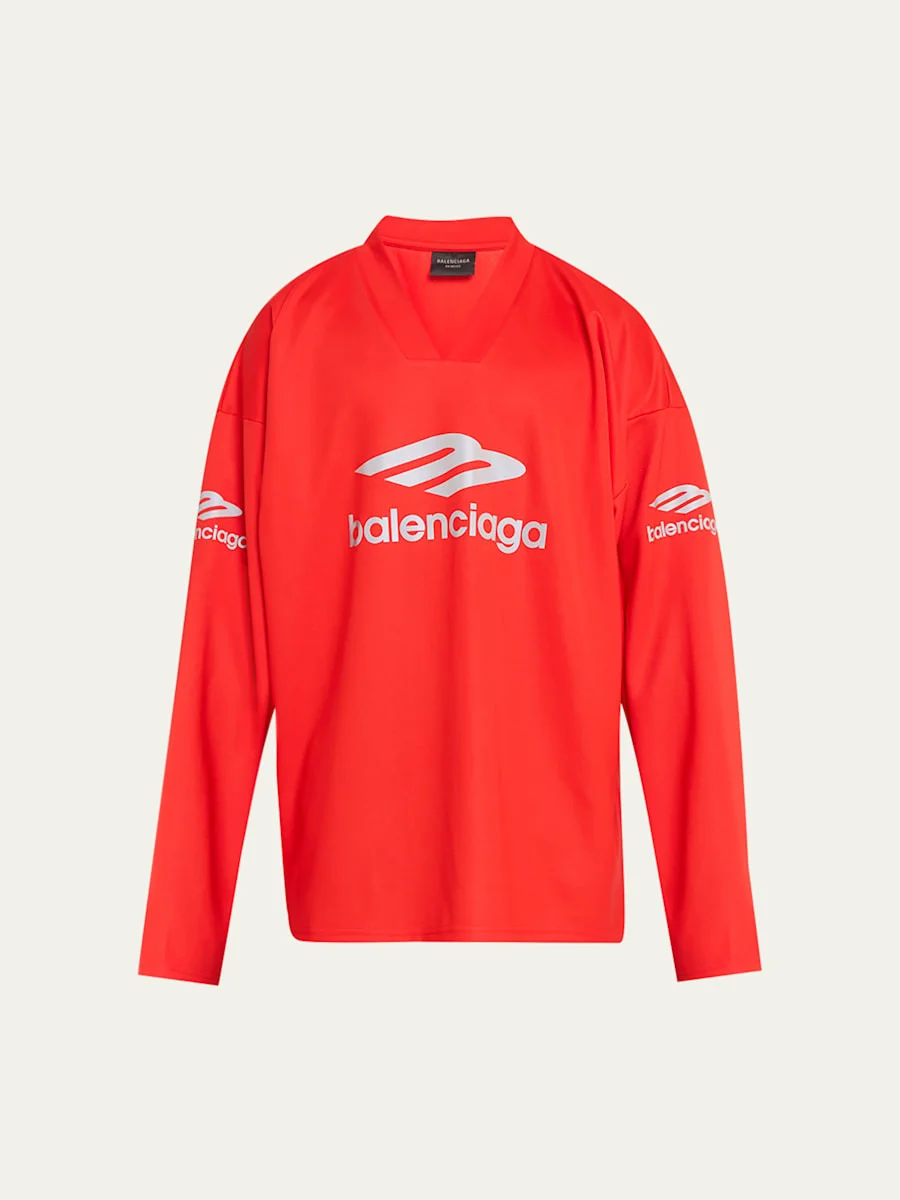 Balenciaga jersey ski shirt with reflective effect artwork Designed to be worn over outerwear pieces V-Neck 3B sports icon artwork printed at front, back and sleeves Long sleeves Pullover style Polyester Dry clean Made in Portugal Model is 6'1"/185cm. Online Inquiries: BGS21_NBTMX| Store Inquiries: #4714734