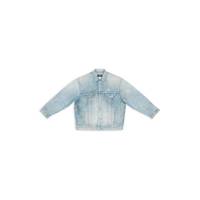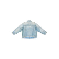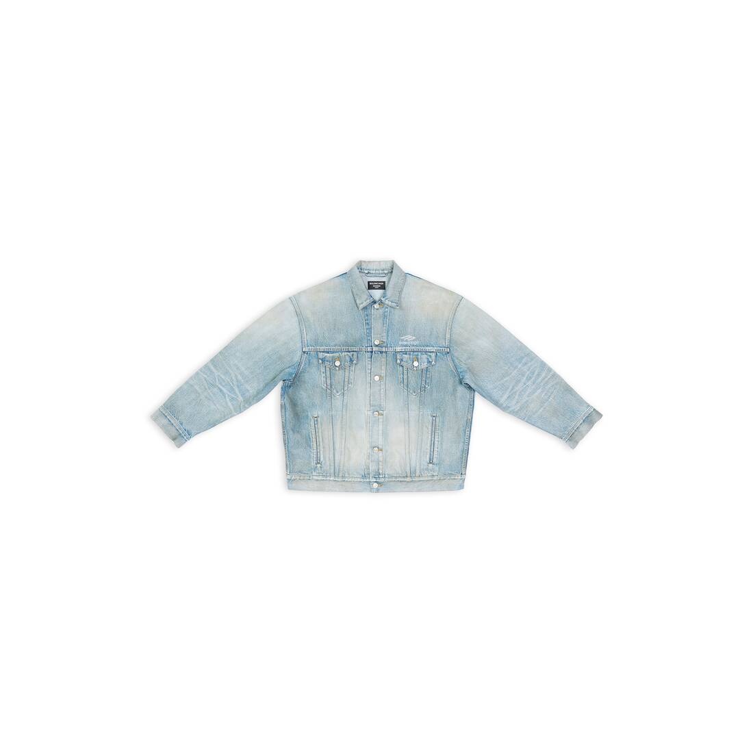 3B Sports Large Fit Jacket in 80's dirty clear blue japanese authentic denim PRODUCT DETAILS • Japanese denim • Unifit • Oversize fit • 7 buttons front • 2 buttoned pockets at chest • 2 slash pockets • Buttoned at cuffs • Adjustable buttoning at waist • Balenciaga engraved buttons • 3B Sports artwork printed • Made in Italy • Dry cleaning • Model is 185 cm / 6'06" and is wearing a size S Material: 100% cotton