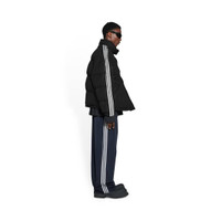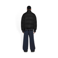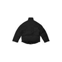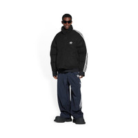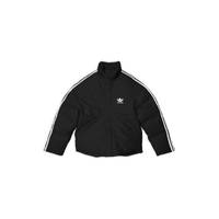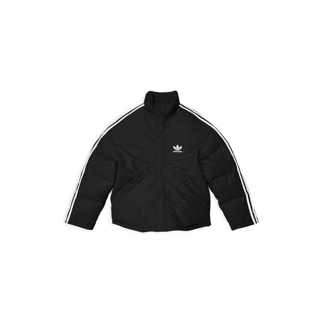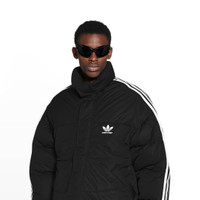 adidas Puffer Jacket in black matte nylon is done in collaboration with adidas. PRODUCT DETAILS • Matte nylon • Cocoon volume • High stand up collar • Concealed zipped closure with snaps • 2 slash pockets • Drawstring at the bottom • adidas Trefoil and Balenciaga logos printed at chest • Contrasting 3-Stripes mark on shoulders and sleeves • adidas® collaboration • The Trefoil logo, the 3-Bars logo and the 3-Stripes mark are registered trademarks of adidas • Made in Italy • Dry cleaning • The model is wearing a size 46 Material: 100% polyamide
