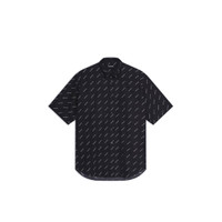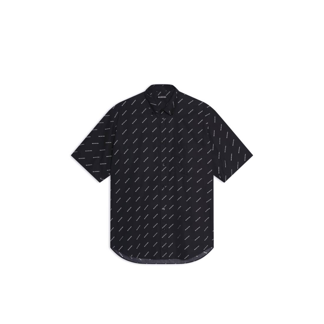 Allover Logo Short Sleeve Shirt Normal Fit in black and white poplin PRODUCT DETAILS • Poplin • Classic fit • Short sleeves • Button-down collar • 6 button front • 1 patch pocket at chest • Printed allover Balenciaga logo • Rounded bottom • Balenciaga engraved buttons • Made in Italy • Dry cleaning • The model is wearing a FR size 38 Material: 100% cotton