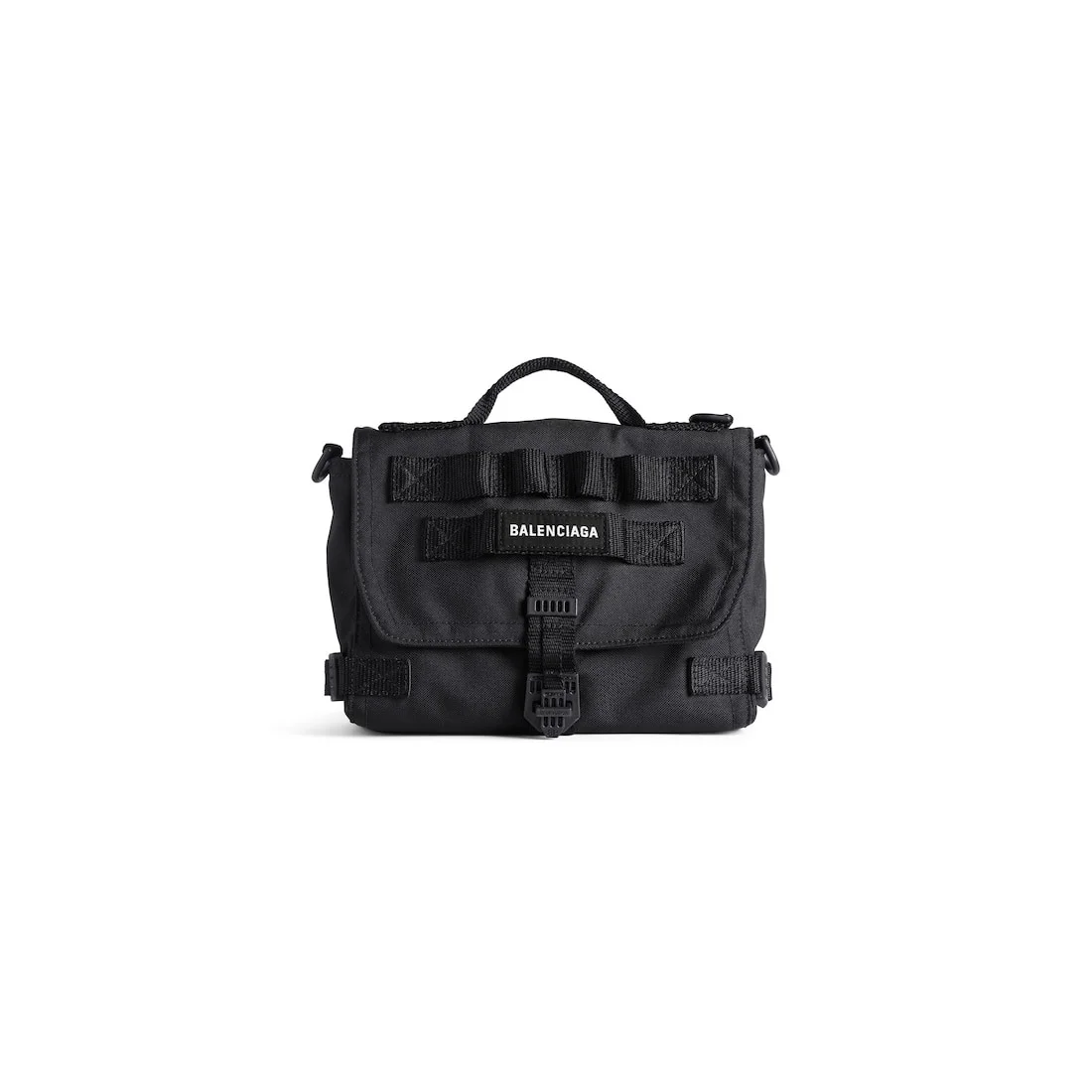 Army Messenger Bag in black recycled nylon PRODUCT DETAILS • Dimensions : L8,8 x H7,2 x W3,5 inch • Messenger bag • One top handle • Two hooks • Ajustable and removable nylon strap • Flap closure with buckle • Balenciaga logo patch embroidered on front • One inner zipedp pocket • One inner patch pocket • Inner press botton closure • Magnetic patch pocket on the sides • Back zip pocket • Cotton canvas lining • Made in Italy • Wipe with a soft cloth Material: 70% polyamide, 30% polyester