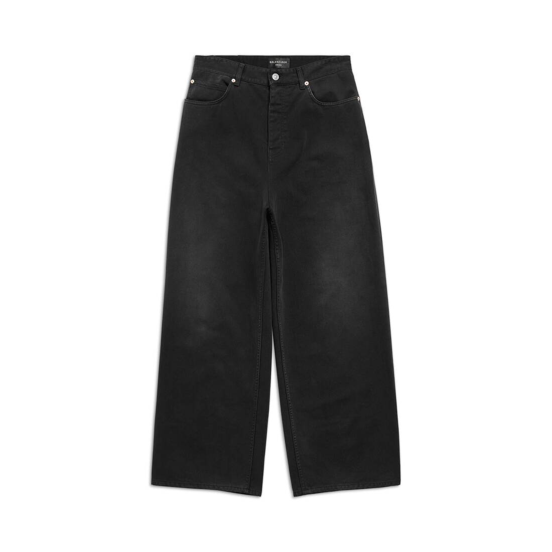 Baggy Pants in black Japanese ring denim PRODUCT DETAILS • Japanese ring denim • This item is unisex • Large fit • Mid-waist • Covered button fly • 5 belt loops • 5 pockets • Balenciaga engraved flex buttons • Balenciaga inlaid patch at back • Made in Japan • Dry cleaning • The model is wearing a size S Material: 100% cotton