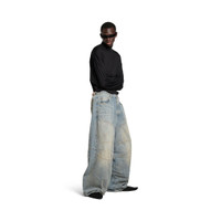 Baggy Pants in light blue Italian ring denim PRODUCT DETAILS • Italian ring denim • Covered zip fly • Printed viscose belt at waist • 5 belt loops • 5 pockets • Waist and knee yokes • Balenciaga engraved flex buttons • Jacron at back • Made in Italy Main material: 100% cotton