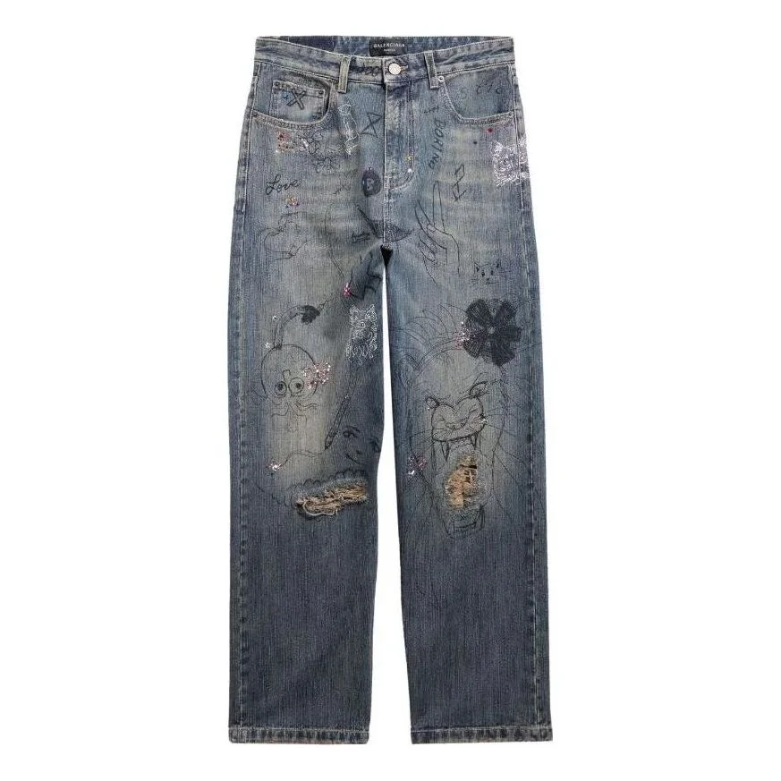 Balenciaga Doodle-Print Straight Denim Pants 'Blue' 746986TOW664036
