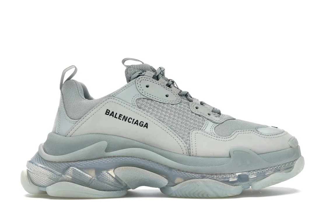 Elevate your sneaker game with the Balenciaga Triple S Clear Sole Grey, a sophisticated iteration of the iconic Triple S silhouette that debuted on November 25, 2018. This version stands out with its understated grey colorway, complemented by a striking clear sole that adds a modern twist to the chunky sneaker trend. Known for its layered, oversized sole and premium construction, the Triple S Clear Sole Grey epitomizes the luxury and craftsmanship synonymous with Balenciaga.The sneaker's design features a blend of textures and materials, including mesh and leather, offering both style and functionality. The clear sole not only enhances the sneaker's visual appeal but also provides durable traction, making it a practical choice for daily wear. It's a perfect example of Balenciaga's ability to blend innovative design with classic aesthetics, catering to those who appreciate sneakers that make a statement.With a retail price of $1,125, the Balenciaga Triple S Clear Sole Grey quickly became a favorite among luxury sneaker collectors and fashion enthusiasts. Its release marked a significant moment in the evolution of the luxury sneaker landscape, showcasing Balenciaga's commitment to pushing the boundaries of design and style. - Style 541624W09O11705 - Colorway Grey/Grey - Retail Price 1125 - Release Date 2018-11-25 - Featured false