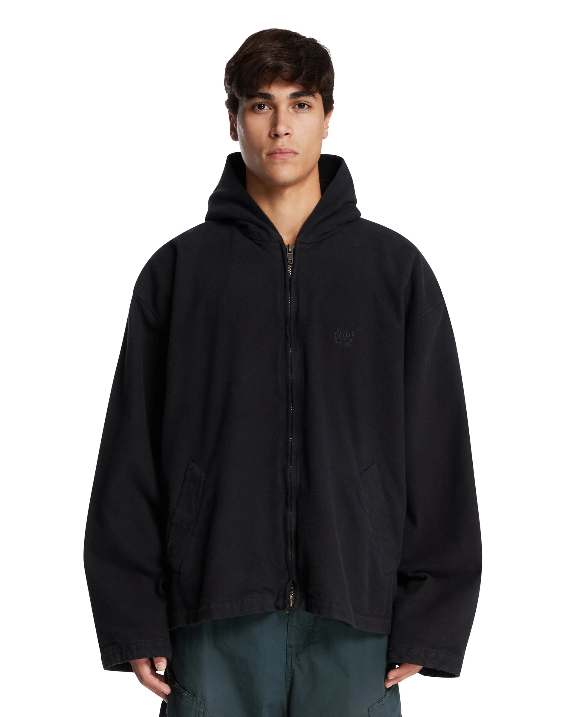 Balenciaga Black Hoodie with Zip. Black cotton, tone-on-tone hood, long sleeves, front zip closure, side pockets, straight hem, tone-on-tone logo on the chest. Relaxed fit, lined. Pedro is 185 cm and he is wearing size III. DETAILS Model: 839072TPM141000 Composition: 100% Cotton; Lining: 100% Polyester Made in: ITALY Season: FW25-26