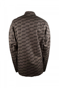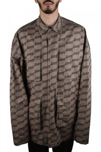 Balenciaga beige cargo shirt. Brown "BB" logo printed diagonally throughout. Button closure. 4 front pockets. Classic lapel collar. Long sleeves. 100% cotton. Made in Italy.