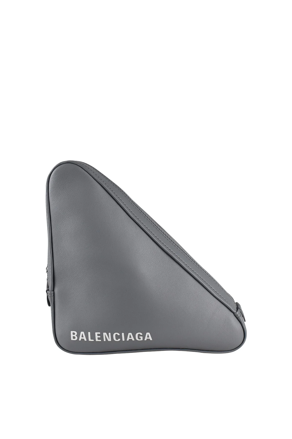 Clutch Triangle M Balenciaga in gray leather. Zipper closure. White logo printed on the front. Dimensions : Width 21 cm x Height 21 cm x Depth 5 cm. Made in Italy.