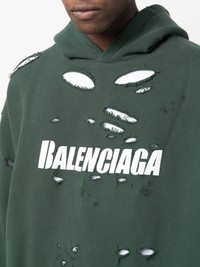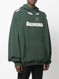 Destroyed Hoodie in dark green and white medium fleece PRODUCT DETAILS • Medium fleece • Rippings and holes allover the fabric • Oversize fit • Dropped shoulder • Caps artwork printed at front • 1 kangaroo pocket at front • Gathered cuffs • Made in Portugal • Cold machine wash • Model is 186 cm / 6'10" and is wearing a FR size S Material: 100% cotton
