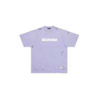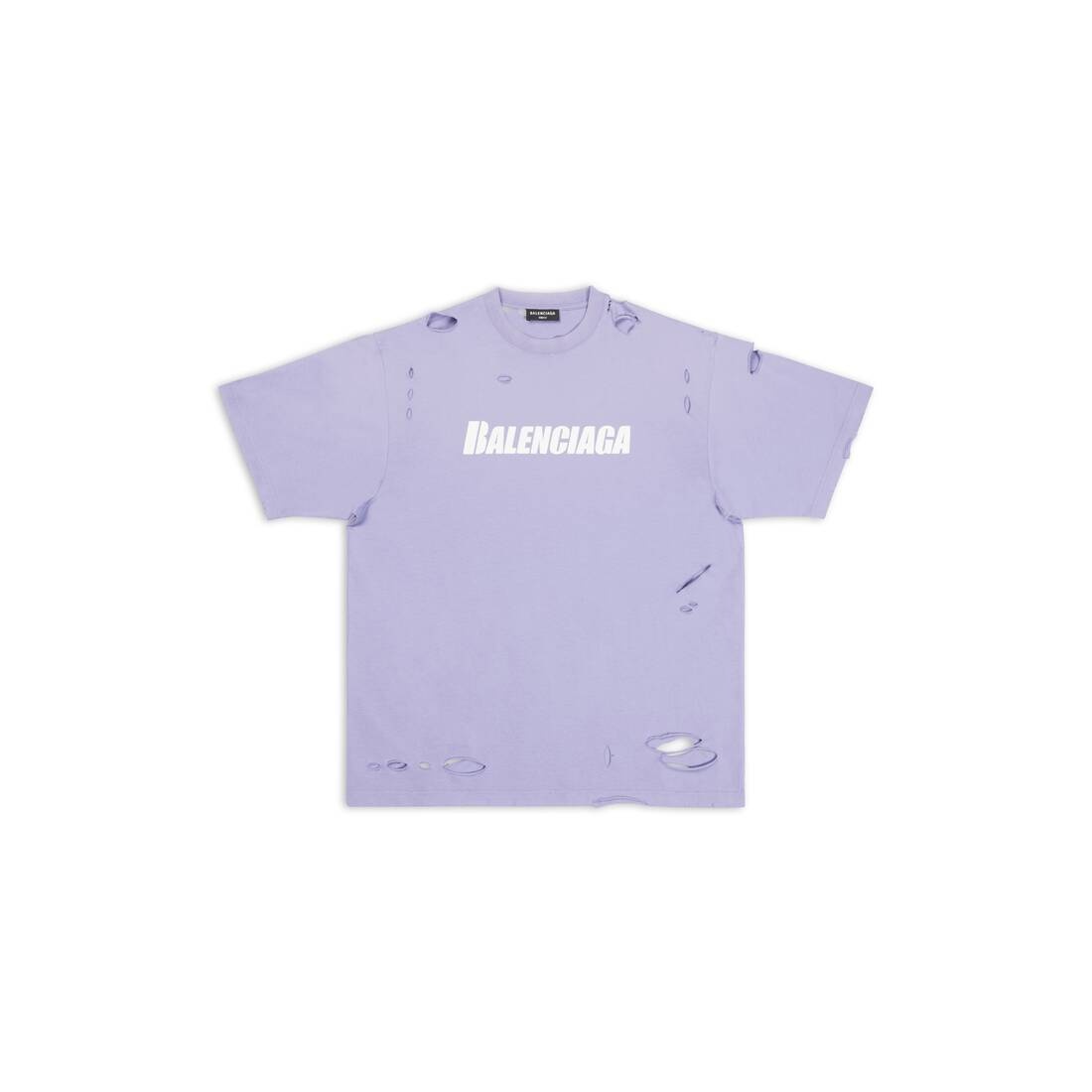 Destroyed T-shirt Boxy Fit in light purple and white vintage jersey PRODUCT DETAILS • Vintage jersey • Unifit • Boxy fit • Crewneck • Elbow sleeve length • Rippings and holes allover the fabric • Caps artwork printed at front • Made in Portugal • Dry cleaning • Model is 177 cm / 5'68'' inch and is wearing a FR size S Material: 100% cotton